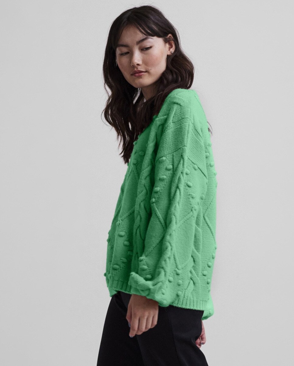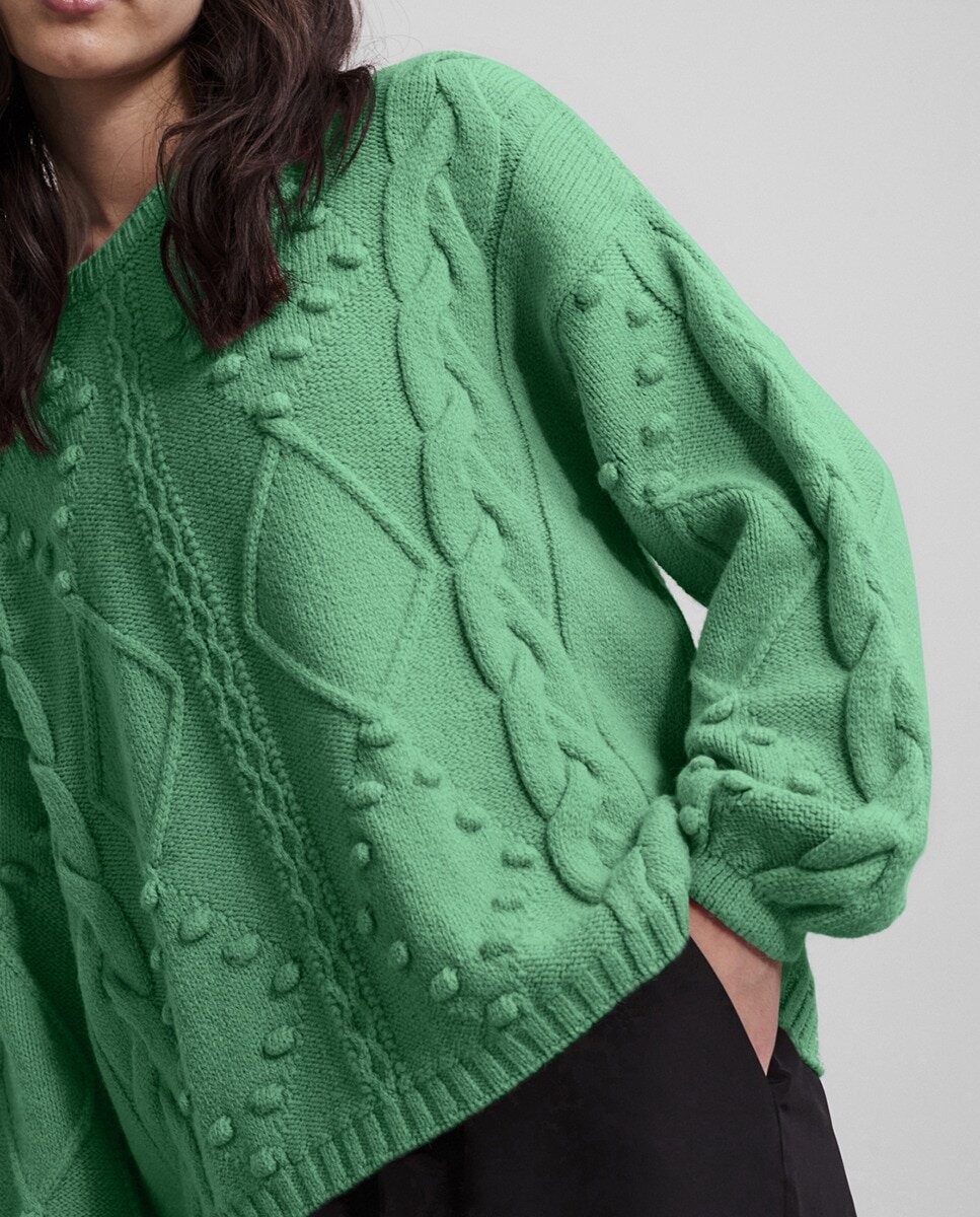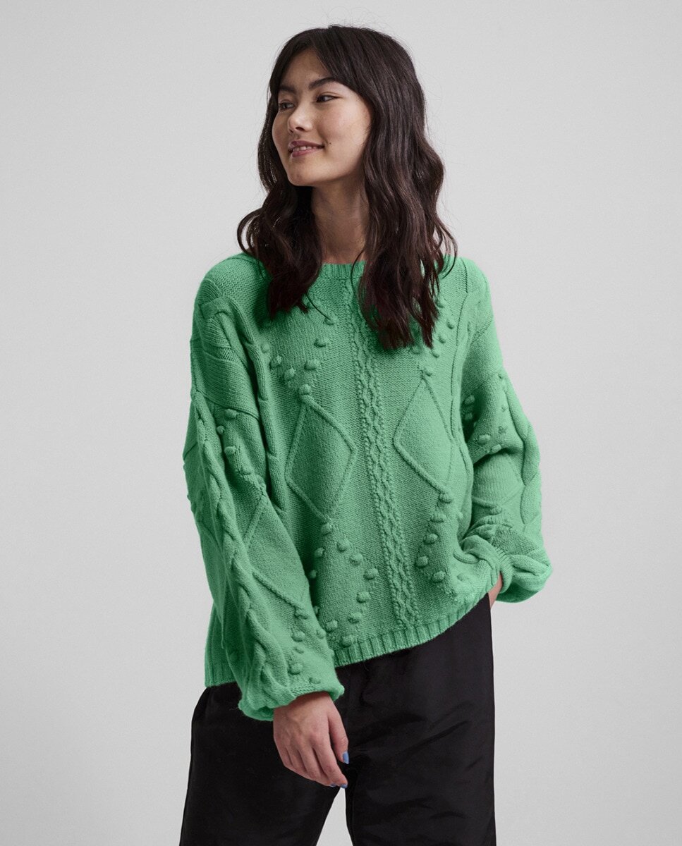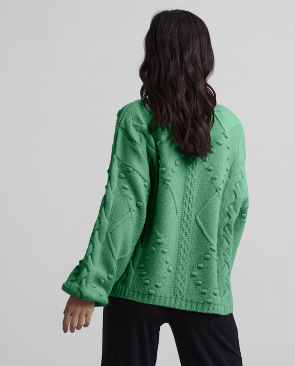 Свитер в плане выкройки связан самым простым способом - спущенное плечо и круглый вырез горловины. У этой модели мне понравился красивый оттенок зеленого цвета и узор в виде очень крупных ромбов с шишечками.