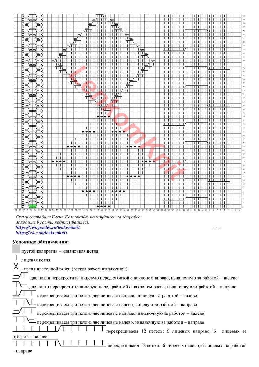 На рисунке - схема центрального узора для лицевых рядов. Зеленым цветом я отметила изнаночные петли (для удобства). По бокам остальные петли переда и спинки - лицевая гладь.