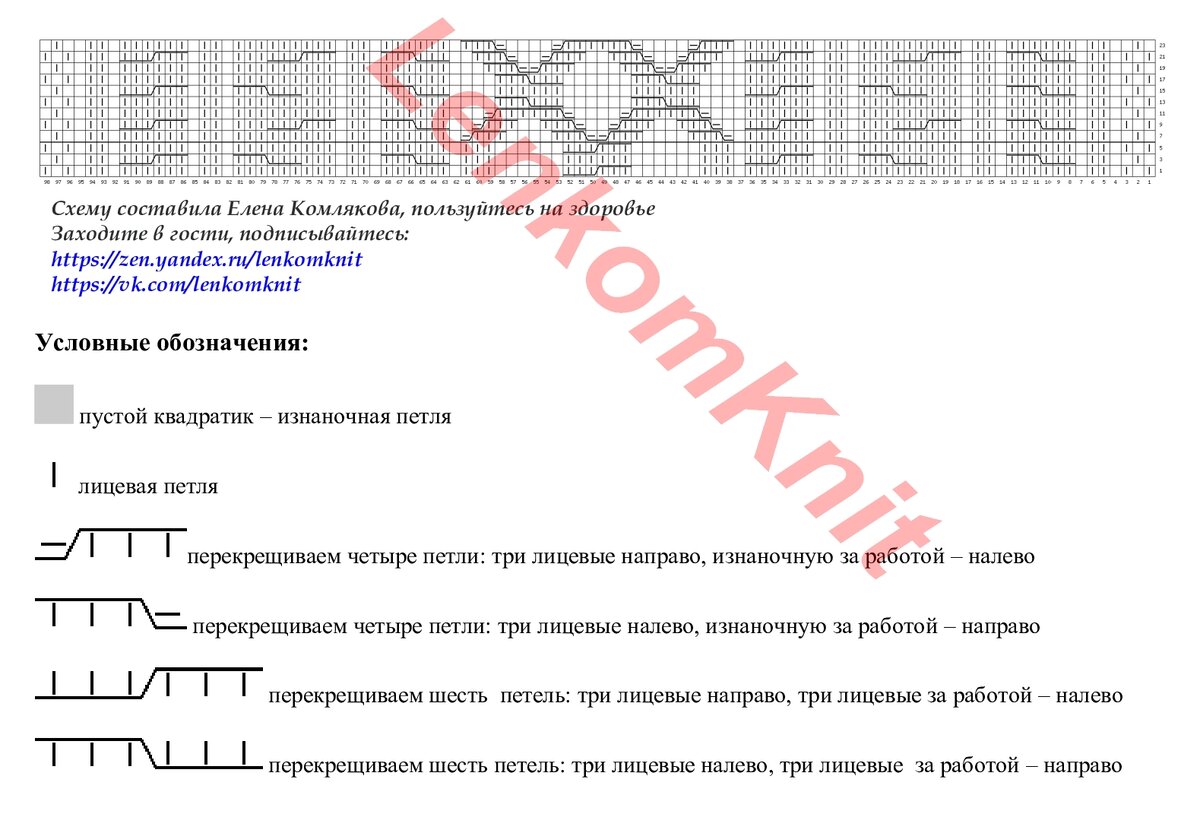 Это - схема узора, точнее - центральная его часть. Остальные петли для получения нужной ширины справа и слева вяжем жемчужным узором (на схеме это первые и последние три петли). Раппорт центрального узора нарисован полностью в ширину и высоту. А косы перекрещиваем в каждом шестом ряду (можно взять другой интервал, какой больше вам нравится и подходит к вашей пряже и плотности вязания).