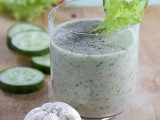 Шаг 1. Огурцы и сельдерей пюрировать блендером. Добавить к ним черенки базилика и еще раз все пюрировать.