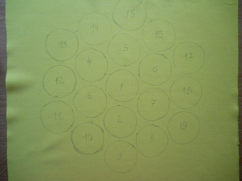 2. Берем подходящую ткань размером 30 х 30 см. Обводим кружок на изнаночной стороне ткани19 раз на расстоянии 5 мм друг от друга. Первый кружок обводим в центре ткани, затем делаем второй ряд кружков, затем третий ряд. Кружочки обязательно нумеруем, чтобы потом не запутаться.