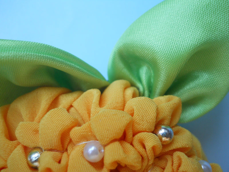 9. Берем два квадрата зеленой ткани: 12 х 12 см и 8 х 8 см. Каждый квадрат складываем по диагонали. Полученный треугольник складываем пополам. Открытые срезы треугольника, взятые вместе, присобераем на нить и стягиваем. Вырезаем кружок диаметром 5 см из зеленой ткани.