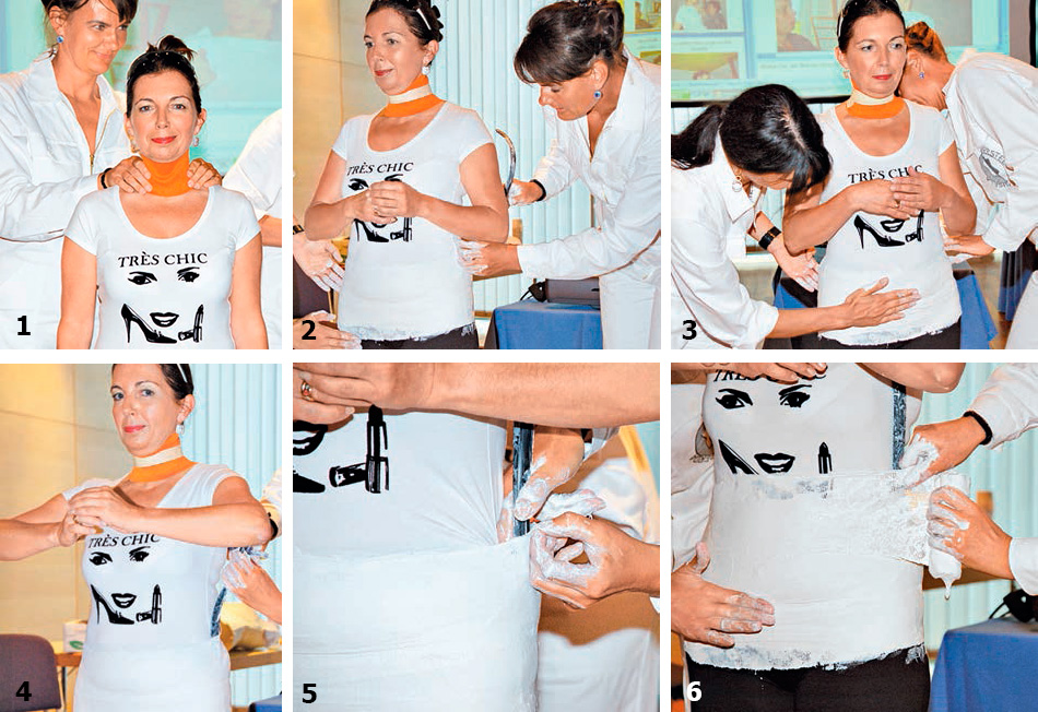 Если бинт кажется слишком длинным, его можно отрезать и наматывать частями. На изгибах фигуры можно делать аккуратные складки. При желании с той стороны тела, где позднее будет разрезаться гипсовый манекен, можно вставить узкую гибкую пластину. Это облегчит разрезание (илл. 2—6).