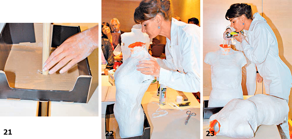 7. Высохший манекен установите на прочный картон. Обведите контур низа манекена и затем вырежьте из картона дно по контуру. Посередине картонного дна сделайте крестообразный разрез и проденьте через него стойку. Затем манекен и стойку нужно приклеить к картону (илл. 21—22).