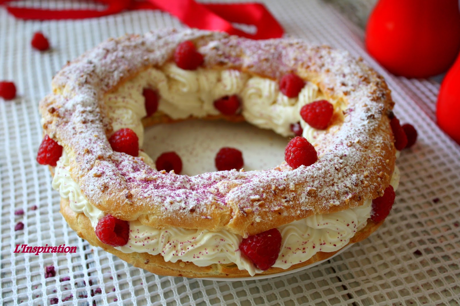 Перед выпечкой кольцо присыпают гранулированным сахаром и молотым миндалем. Крем может быть самым разным - от заварно-масляного до взбитых сливок с малиной. Крем Ispahan - это розовый крем на основе маскарпоне.