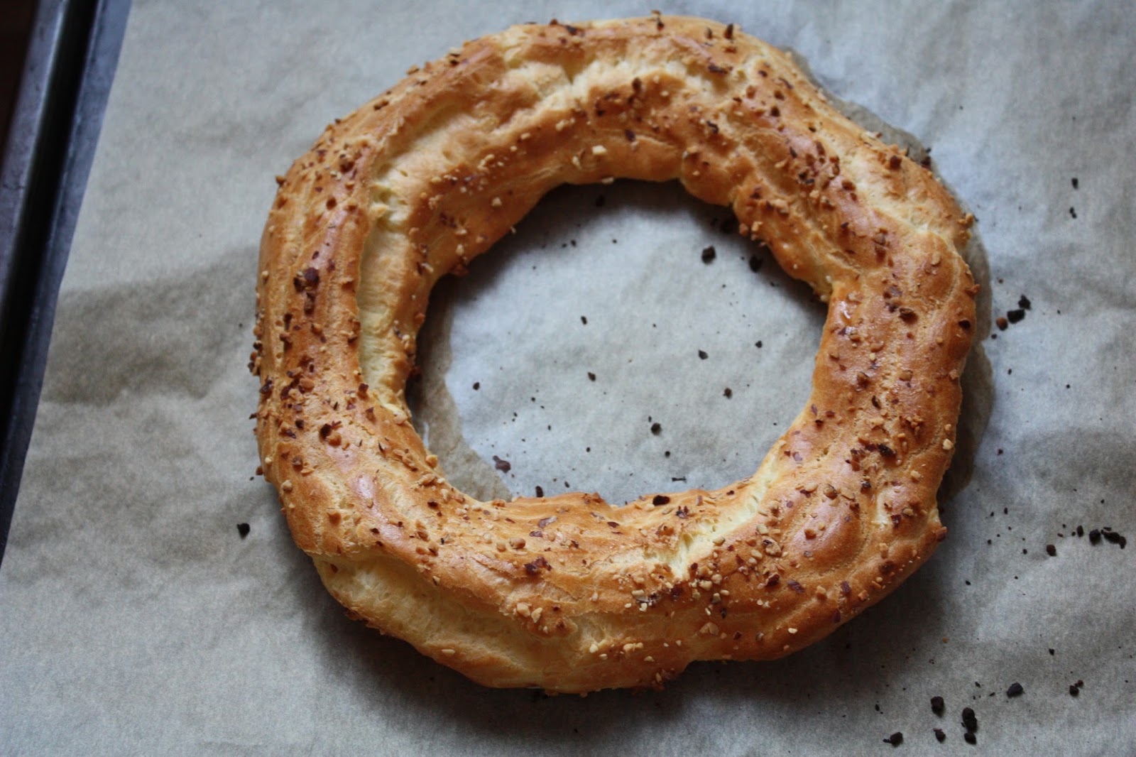 Даем чуть остыть и набираем тесто в кондитерский мешок. разогреваем духовку до 200 градусов. На пергаменте с обратной стороны рисуем круг диаметром 20 см. Теста и крема хватает на 2 таких кольца или 12 маленьких колечек. С помощью кондитерского шприца или мешка наносим тесто, один ряд внутри обведенного круга, следующий ряд внутри -первого, а третий по центру наверху первых).