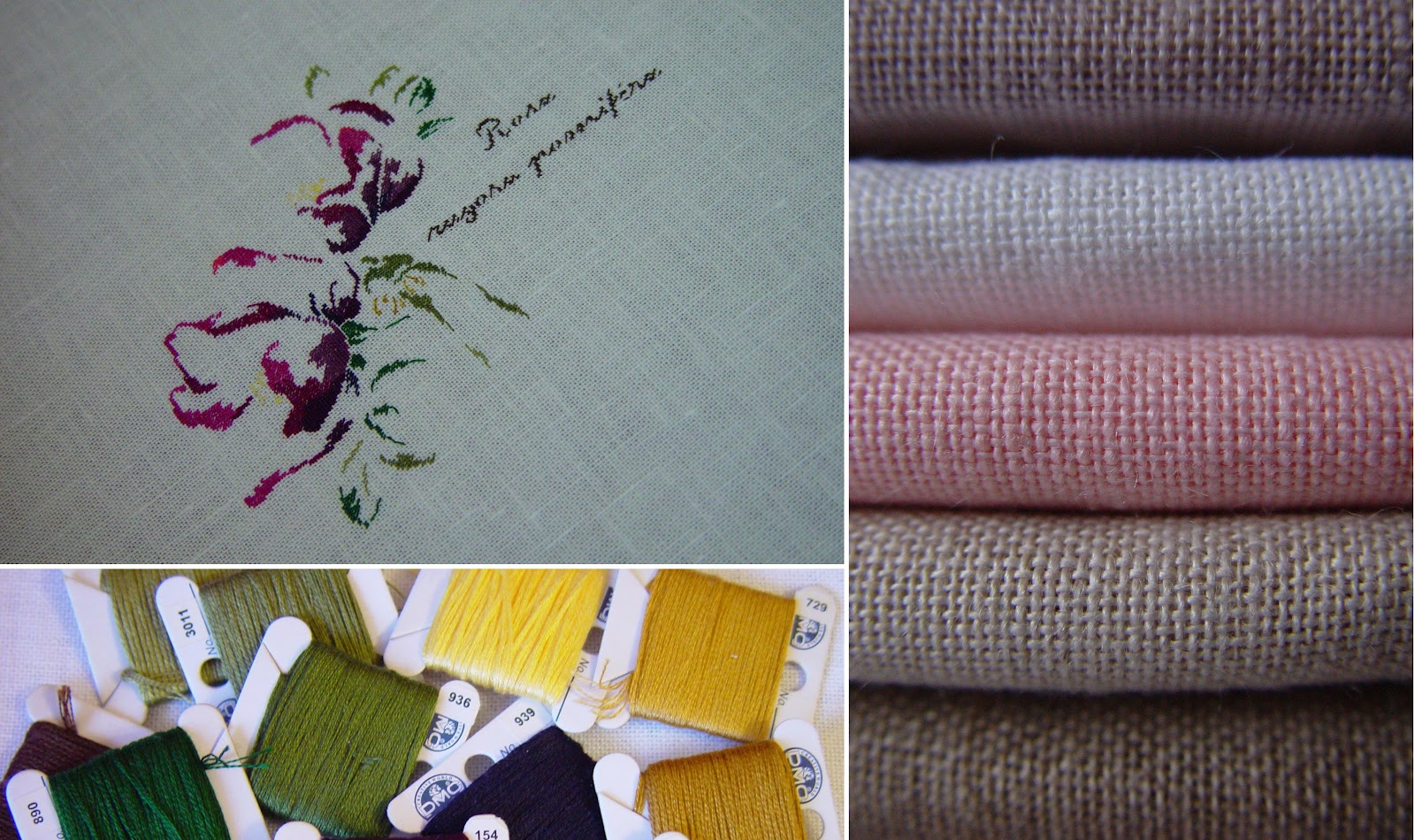 Мари-Терез вышивает и рекомендует вышивать на льне одной нитью мулине (хлопкового или шелкового) через одну нить основы. Многие вышивают на равномерке типа Linda, Lugana, Bellana, Murano, Brithey и прочей ткани равномерного переплетения, а некоторые даже приспособили двунитку для вышивания по схемам мтsа, но на мой взгляд, оба этих варианта хоть и бюджетнее, но смотрятся в итоге немного грубовато. Лен все же придает некоторую нежность, воздушность, натуральность.