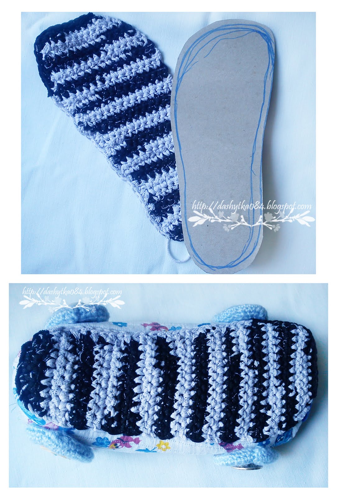 Вяжем подошву. Я примеряла по обведённой ножке. Вязала из футболки свекрови. Разрезала на ленточки тем же макаром, что и для