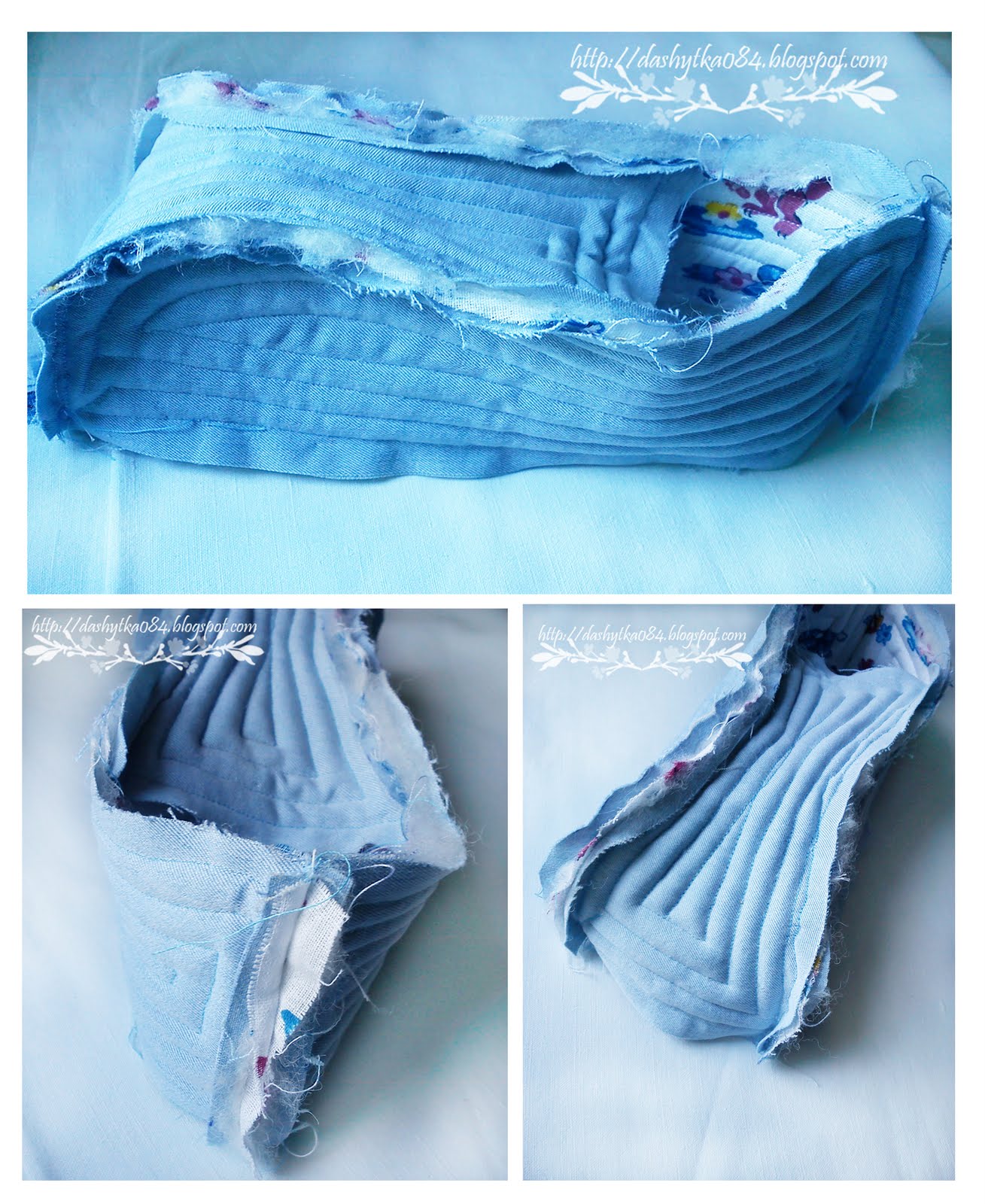Выворачиваем "лобовое стекло" и вставляем подкладку в тапочек. Загибаем краешки подкладки и "корпуса машины" и тут же скалываем, пока не разогнулись. Бедные мои иголочки! Поскручивались буквой "зю", но держали, молодчаги!