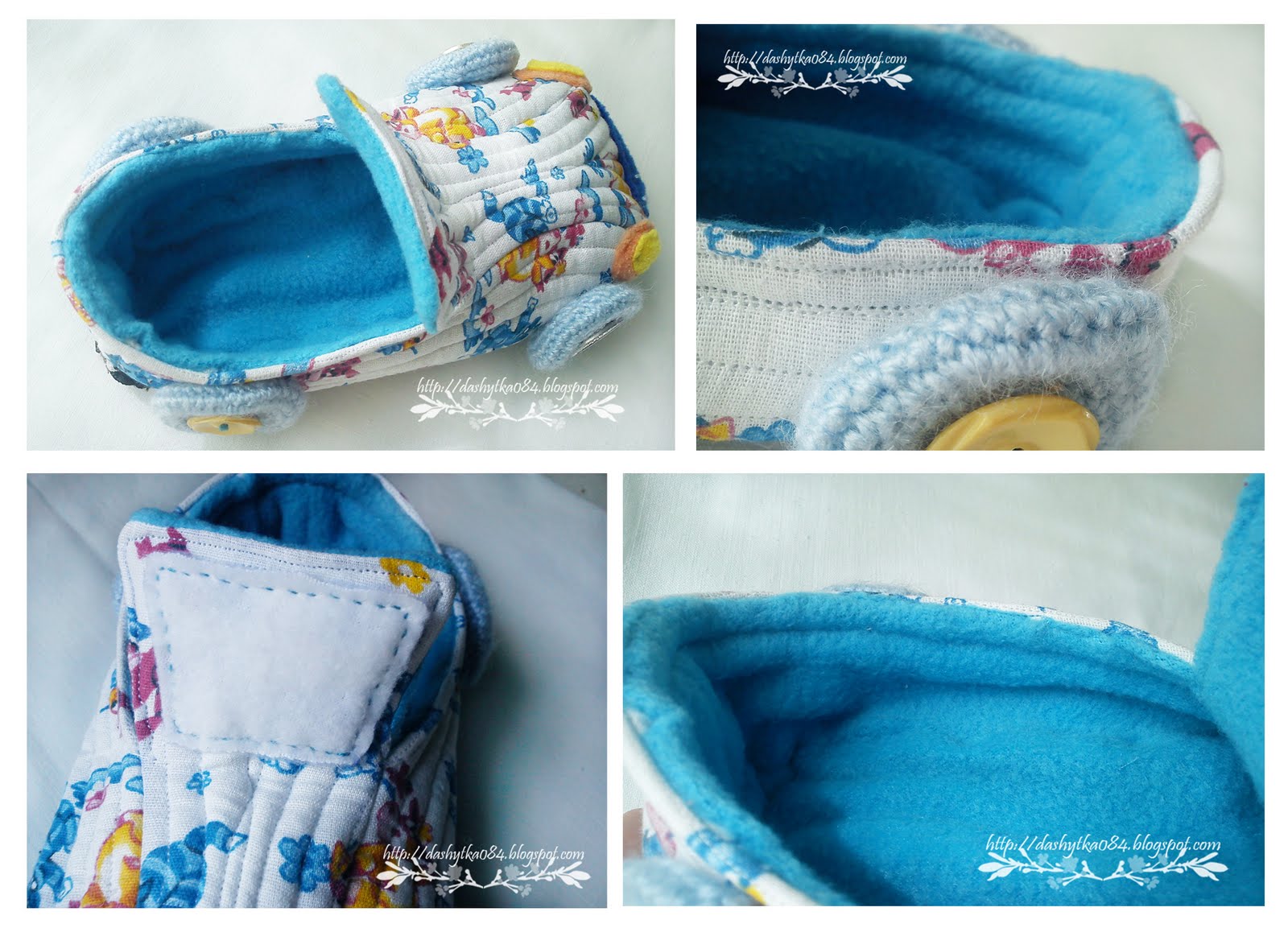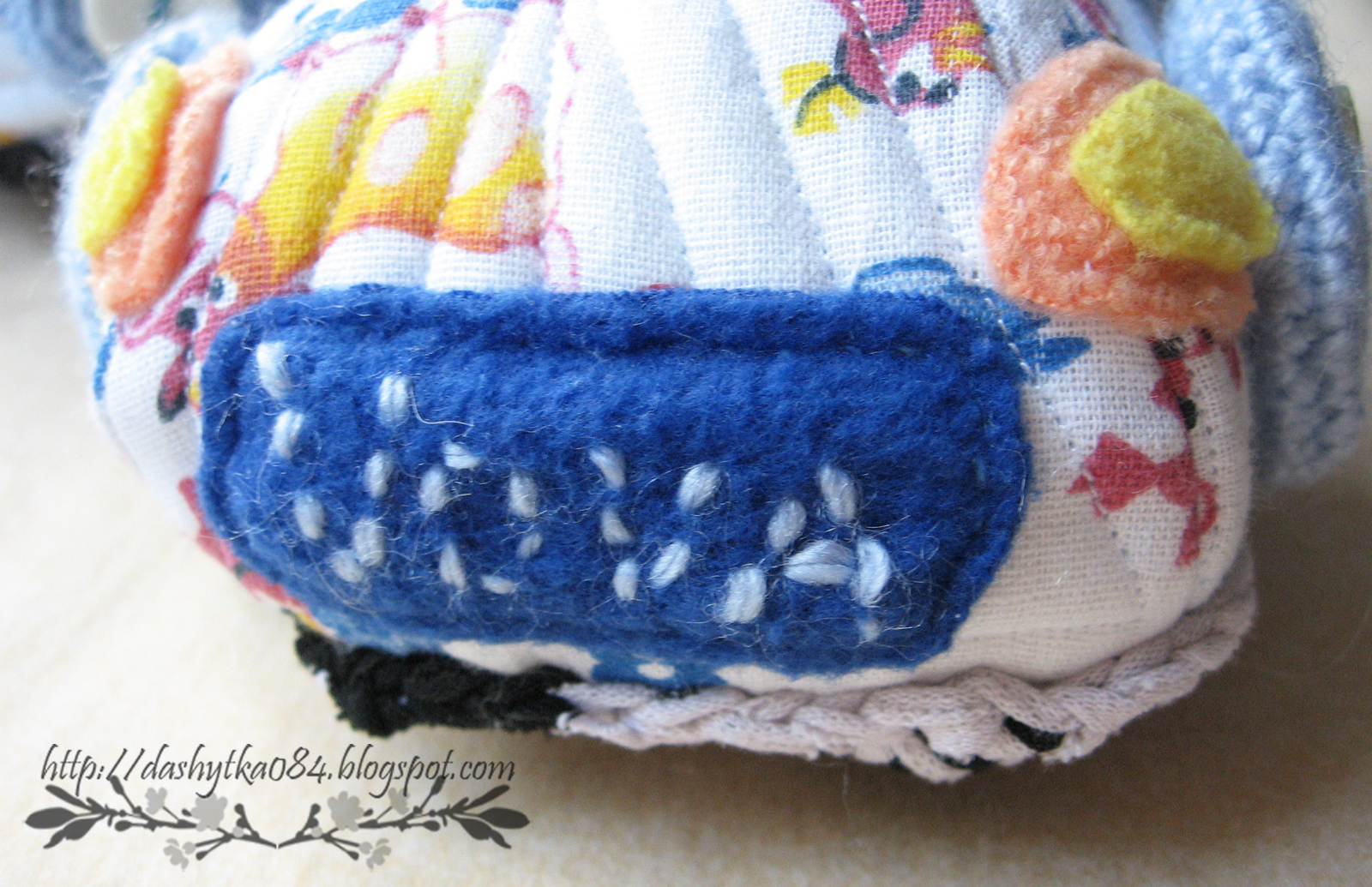 Прострачиваем по кругу, не забывая о лобовом стекле. Я строчила первый круг возле самого краешка, а второй - отступив около 5-7 мм от края. Вот здесь-то мне и помешали задние колёса. Так что можно их и потом пришить. Подождут, ничего с ними не случится. Главное, убрать подальше от детских глаз ) Да, ещё я прихватила подкладку к тапочку в нескольких местах, чтобы не сбивалась в кучу )