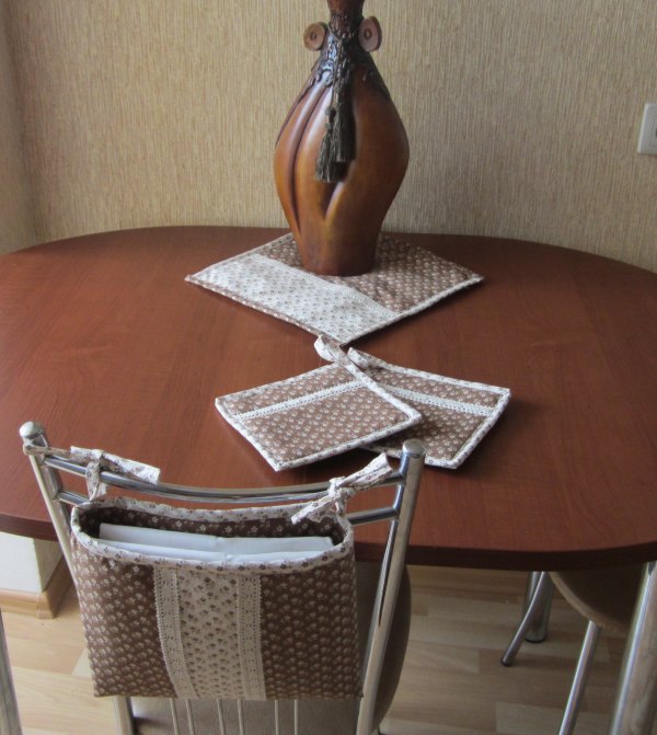 Не знаю, что на меня нашло вчера, но возникла идея срочно пошить такой набор для кухни: две прихватки, сумка для салфеток ( чистого полотенца, свежей прессы, любимой книги, или тетради с рецептами) и салфетка трансформирующаяся в хлебницу. ))