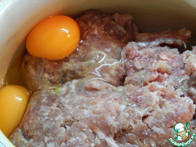 В подготовленный фарш (в котором уже есть соль, лук и специи по вкусу) добавляем яйца. |