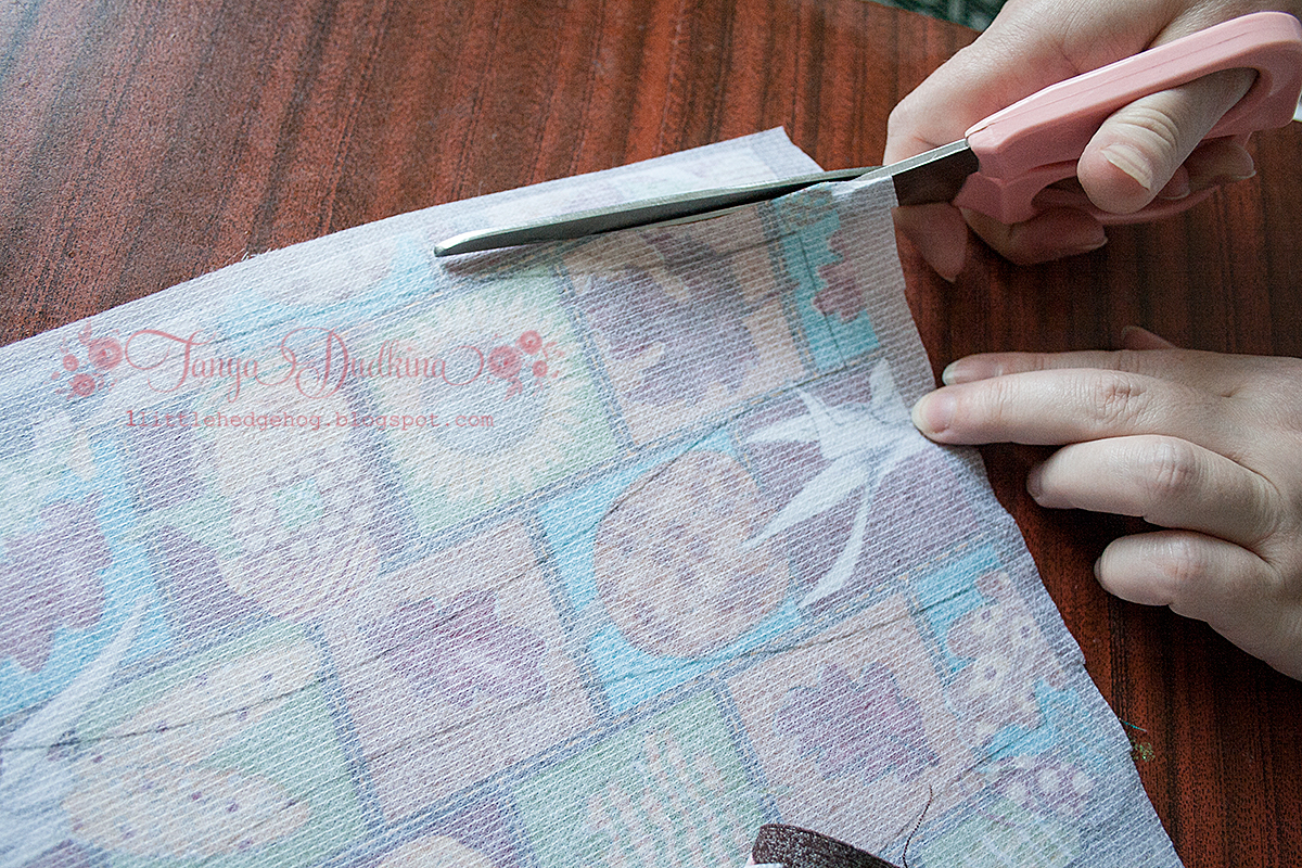 Замеряем диаметр отверстия, которое получилось после того как шар сшит и вырезаем из ткани с припуском на шов - 1 см. Диаметр у меня - 7см + 1 см припуск. Делаем надрезы небольшие как на фото, за них будем пришивать донышко к шару.