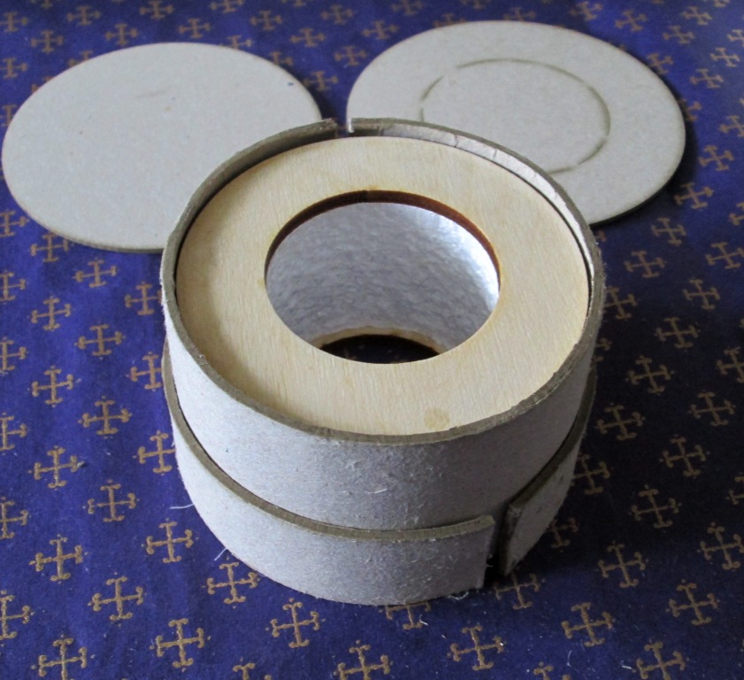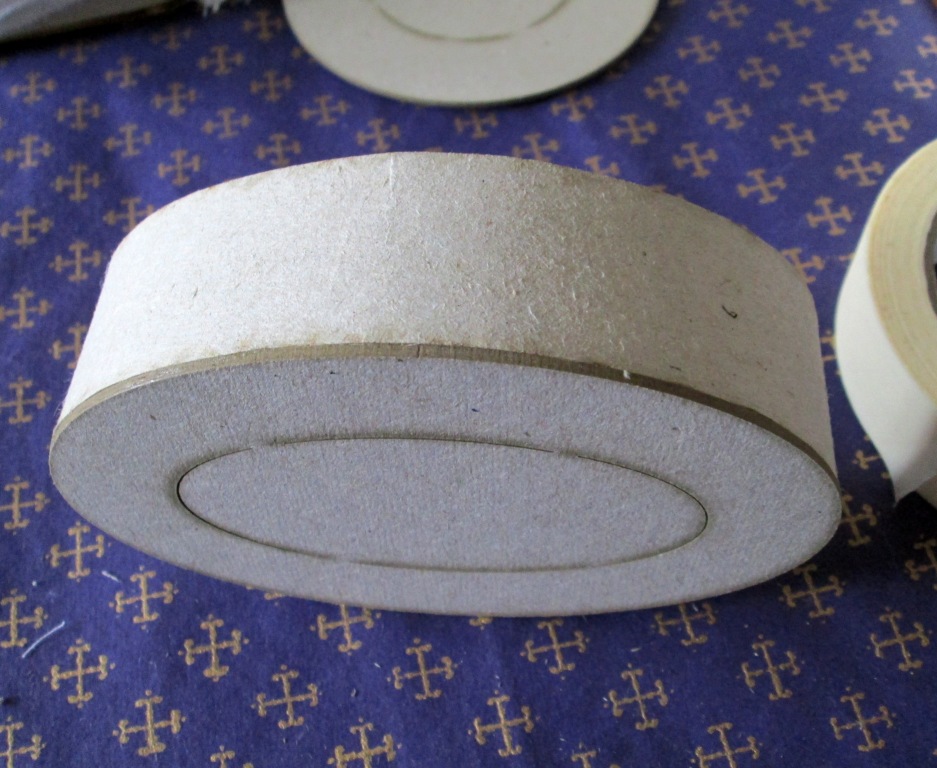 2. Оборачиваем мокрым картоном болванку. Если коробка с крышкой (не откидной!), то бортик от крышки кладем поверх тела шкатулки. На фото: большое кольцо - тело шкатулки. Маленькое кольцо - бортик крышки.