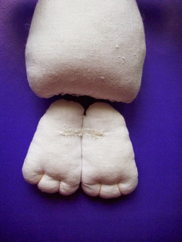 Для пришивания нижних лапок, нужно повернуть их разрезом к нижней части туловища. Зашитое на лапках отверстие должно попасть под тельце.