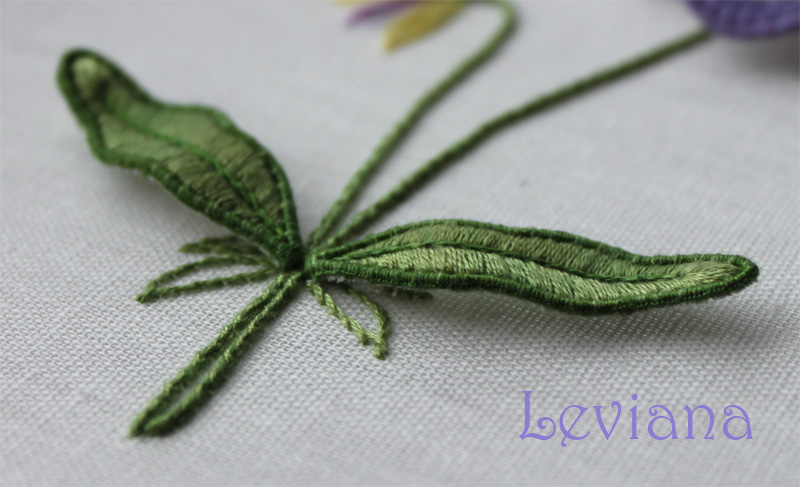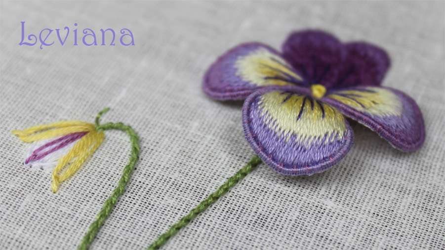 Анютины глазки в технике объёмной вышивки гладью.