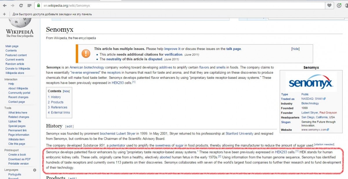 Разрешите представить американскую биотехнологическую компанию Senomyx Co Ltd, основным профилем которой является производство различных пищевых добавок для пищевой и косметологической промышленности. Если мы зайдем на англоязычный сайт Wikipedia, то узнаем, что разработанный компонент НЕК293 является гордостью вышеупомянутой компании.