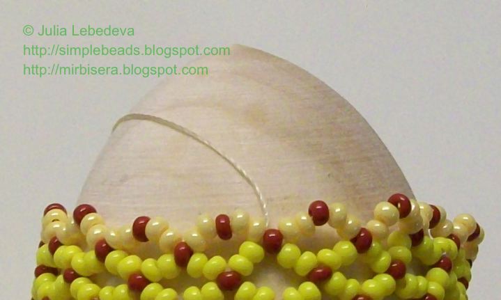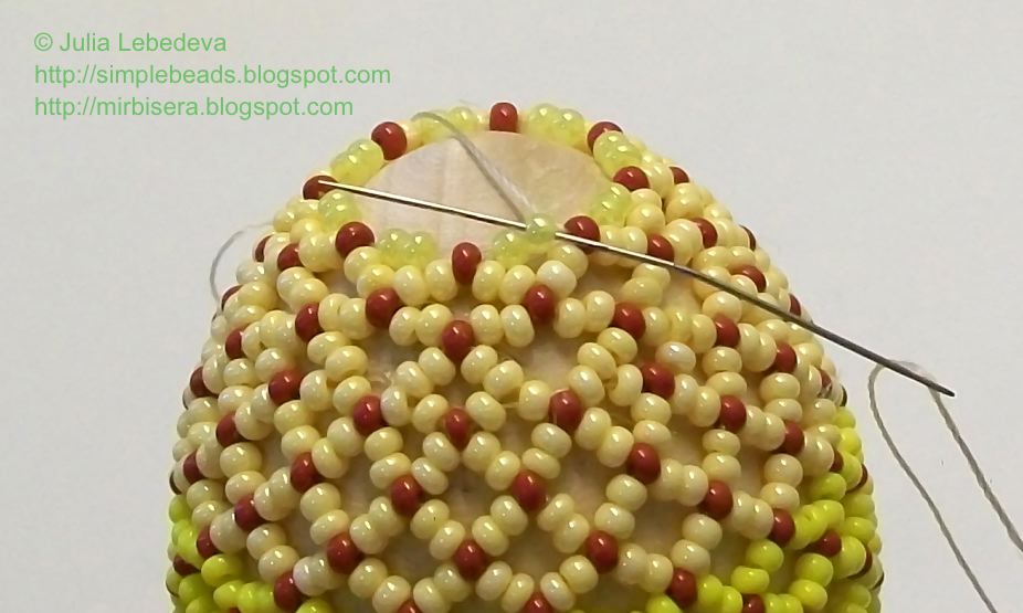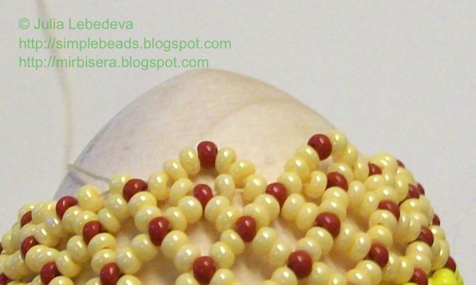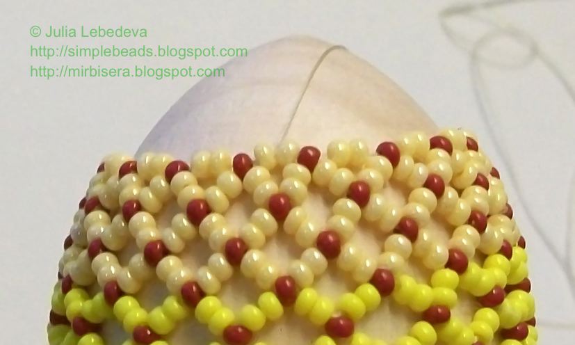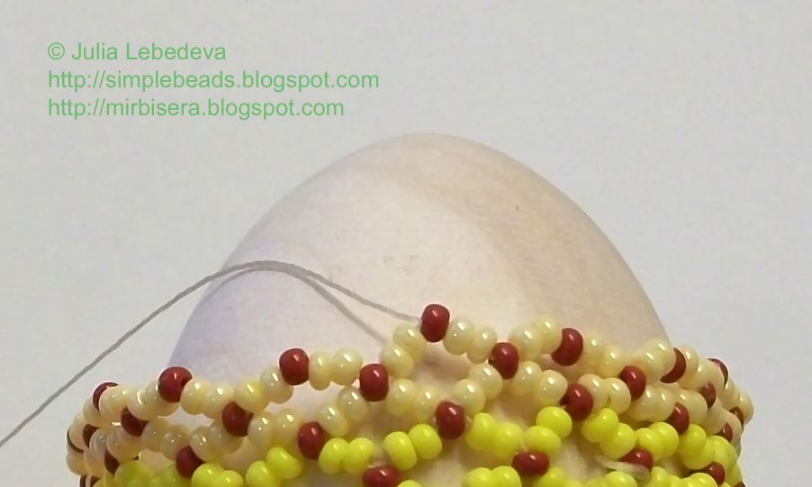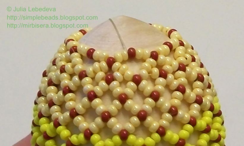 Таким образом проходим целый круг вокруг яйца. В итоге количество отрезков вокруг яйца (и, соответственно, количество коричневых бисеринок на верхнем крае) уменьшилось в два раза.