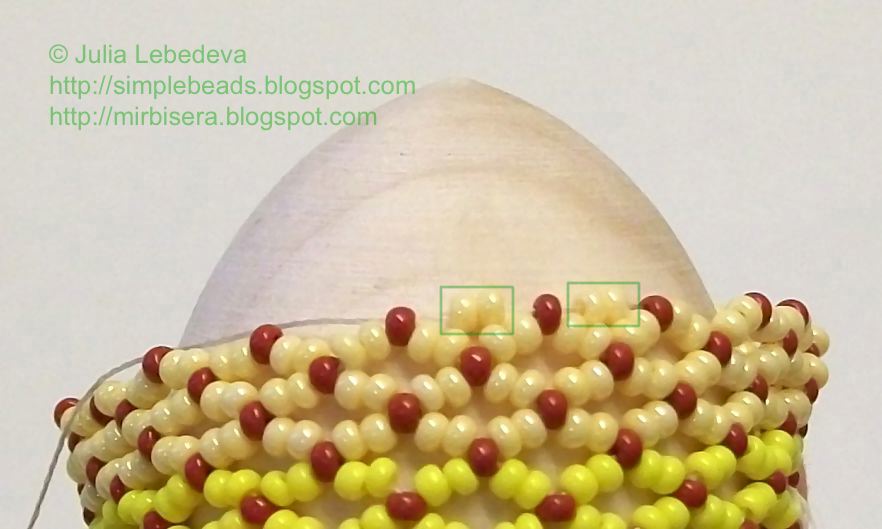 Набираем между коричневыми бисеринками на верхнем крае полотна дополнительные отрезки бисеринок, состоящие из 2 жёлтых бисеринок. Туго затягиваем нить - в результате полотно снова поднялось вверх, и незакрытой осталась только самая верхушка яйца.