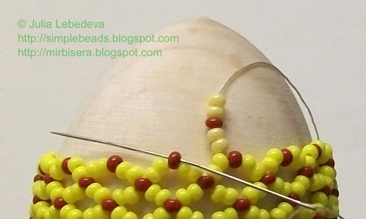 По окончании каждого круга не забываем выводить нить к коричневой бисеринке на самый верх плетения.