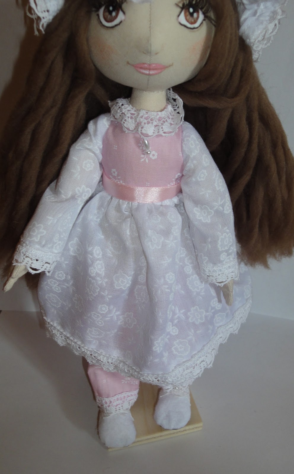 Вот так кукла стоит на подставке. На первых порах я вполне обходилась такими подставками, так как куклы имели длинные платья и вся подставка полностью была скрыта. Правда, такой способ не дает оптимальной устойчивости. Поэтому в следующей части я расскажу, как сделать подставку для куклы функциональнее.
