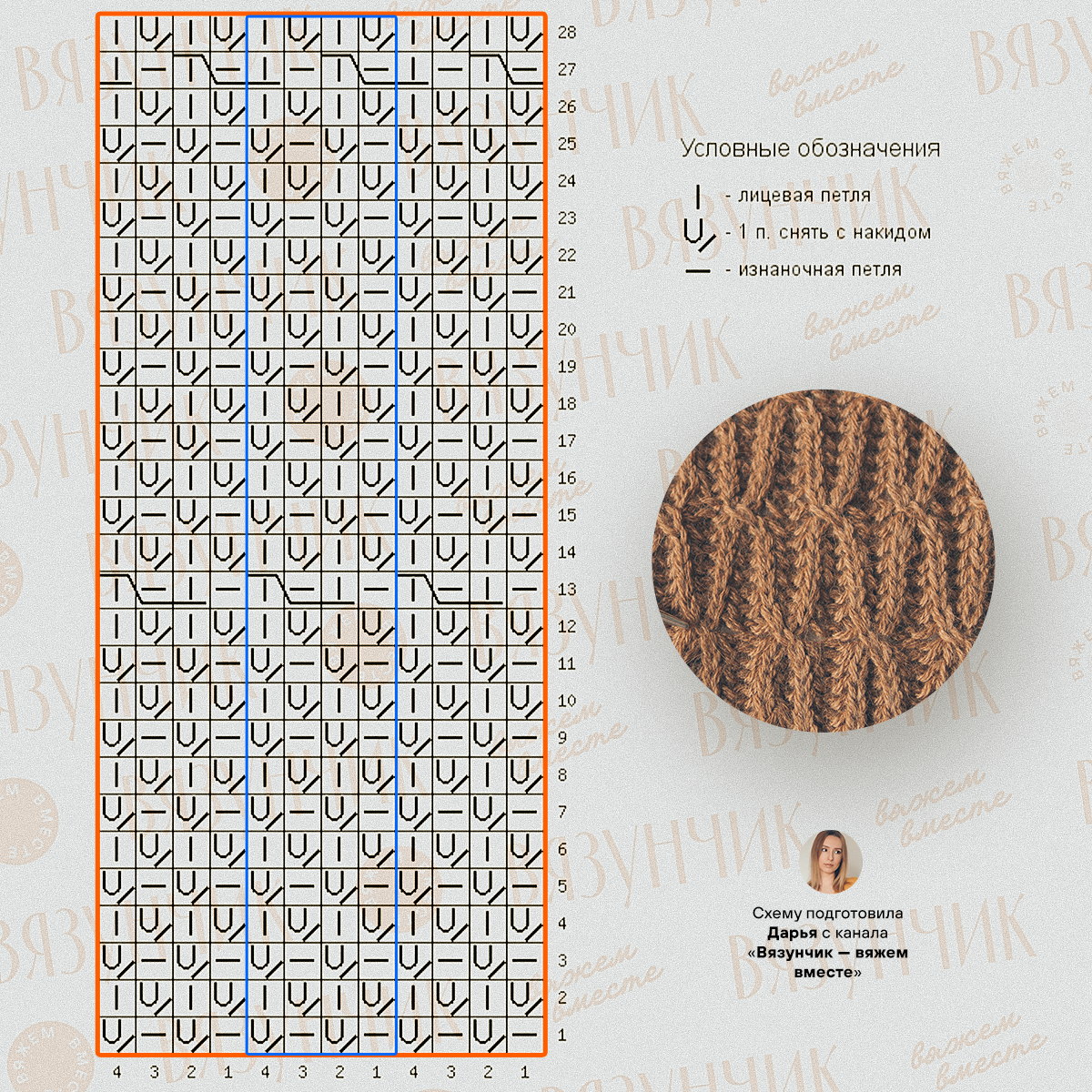 На схеме синей рамкой выделен 1 раппорт узора — 4 петли и 28 рядов. Здесь все ряды, включая изнаночные, но для вязания по кругу.