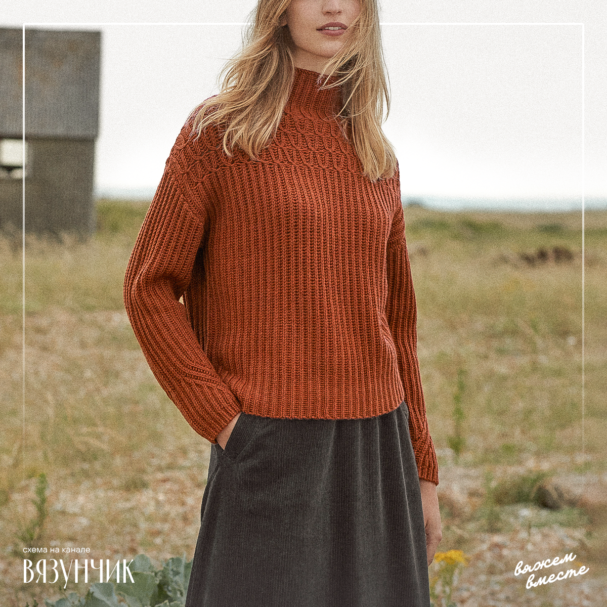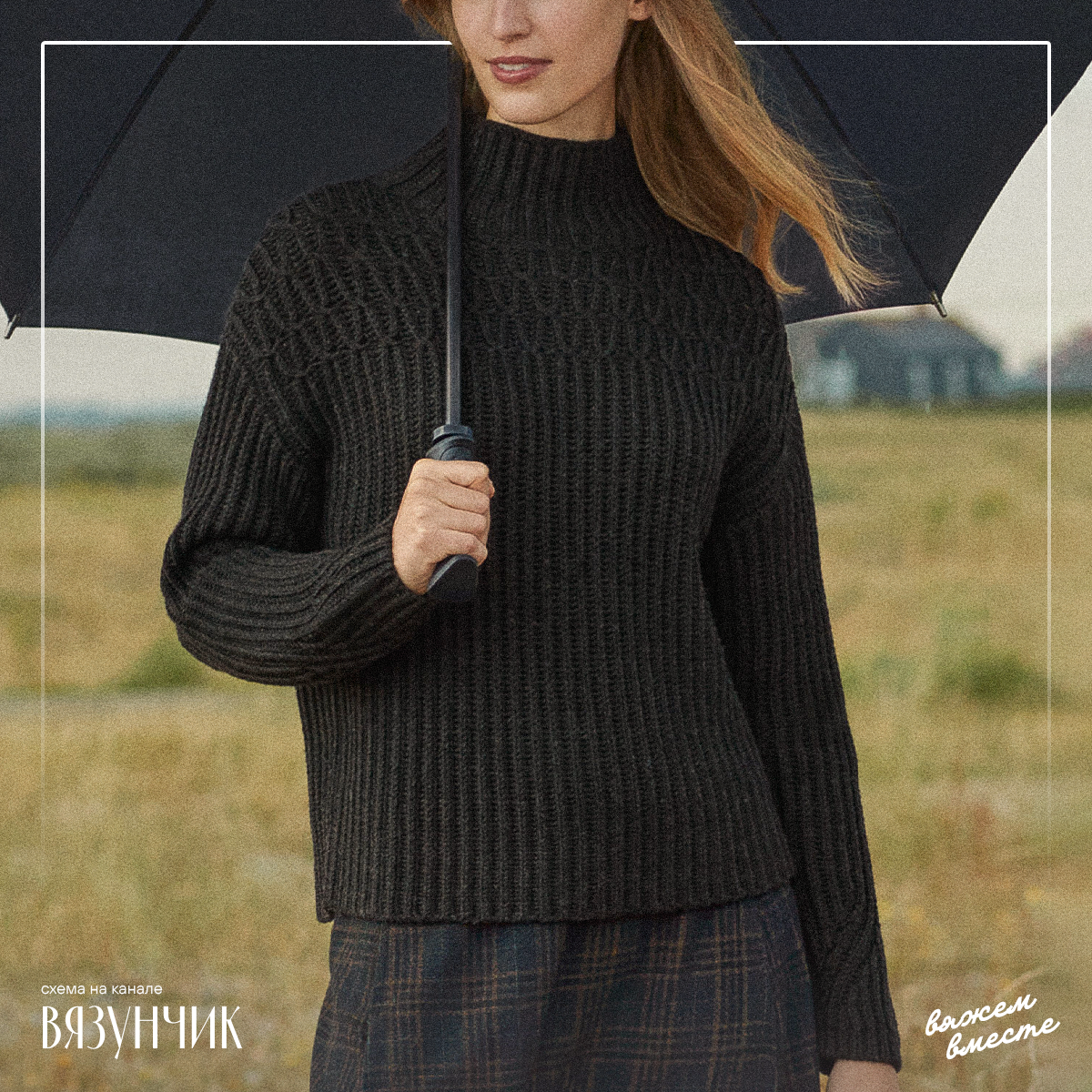 Основная часть свитера — патентная резинка. Верхняя часть спереди украшена красивым узором с перекрещивающимися между собой петлями.