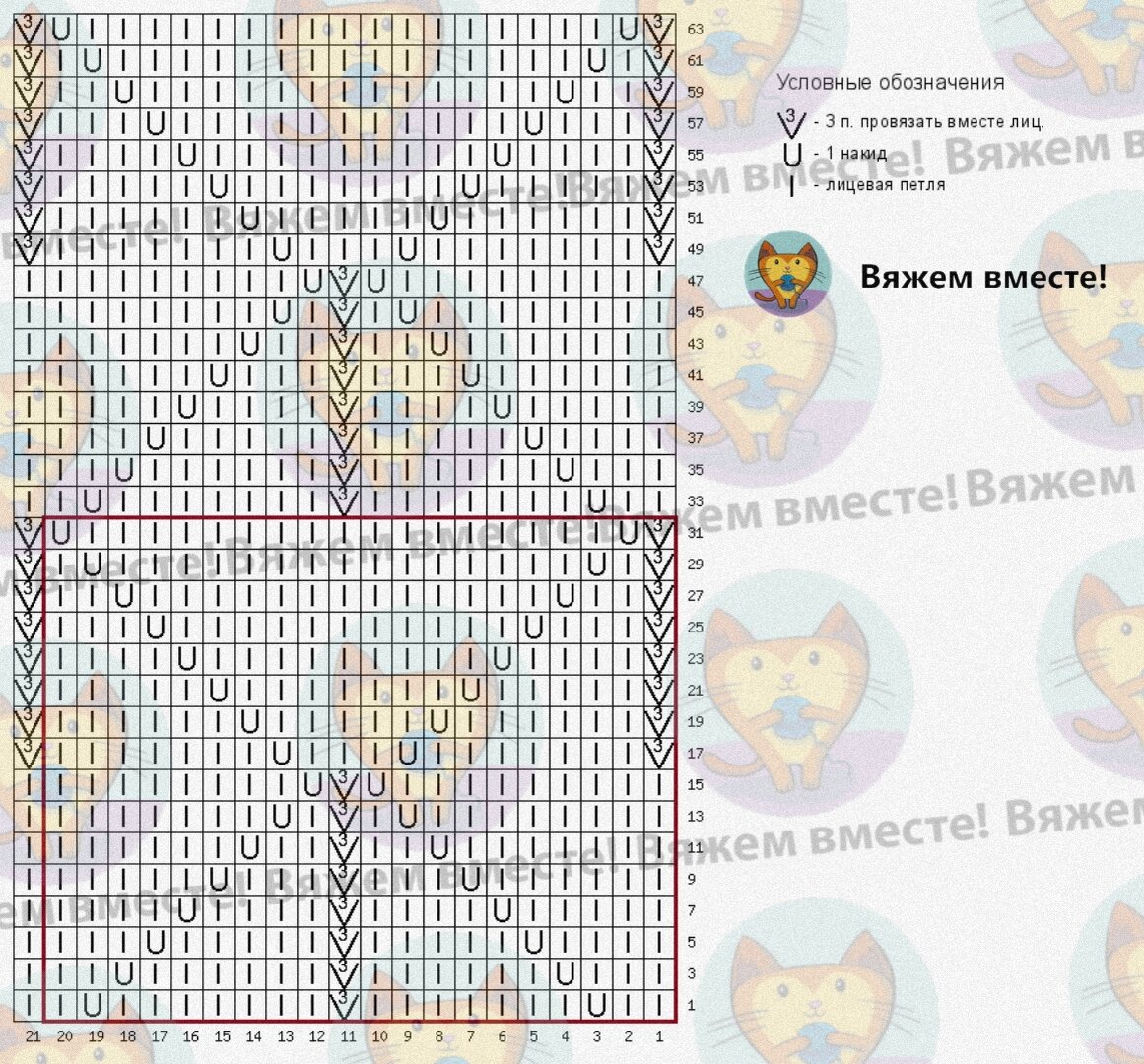 Раппорт узора равен 20 петлям по ширине и 32 рядам по высоте, на схеме заключён в красную рамку.