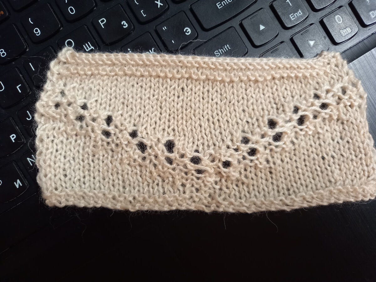 У меня в запасах нет пряжи, состоящей из 100% полиэстера. Пришлось связать образец из того, что есть: пряжа Vita Brilliant, 45% шерсть ластер, 55% акрил, 380 м/100 г. В образце ровно 1 раппорт узора.