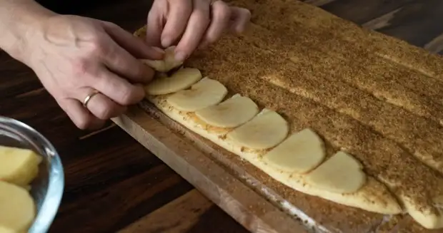 Яблоки очистить от кожицы и семян, нарезать дольками. Тесто разделить на две части. Каждую раскатать в пласт и нарезать на длинные полоски. Смазать сверху мягким сливочным маслом.