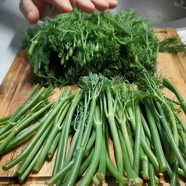 Ну что, погнали? Берем укроп. Много. Стебли отрезаем или оставляем, как хотите. Я убираю и пускаю их на огурцы. А с верхушками уже готовлю соус.