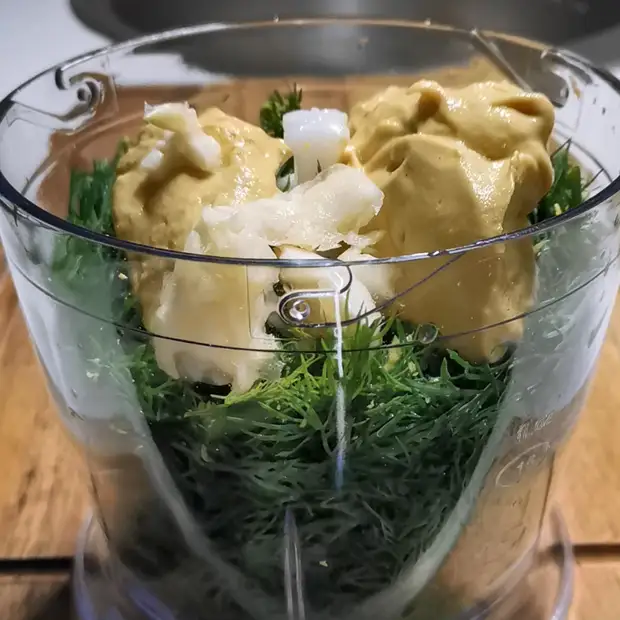 Что еще? Берем дижонскую горчичку, Обычная столовая не подходит. Вернее можно, но не самый лучший вариант. С такой будет горьковато и островато. А дижонская в самый раз. Кладем к укропу.