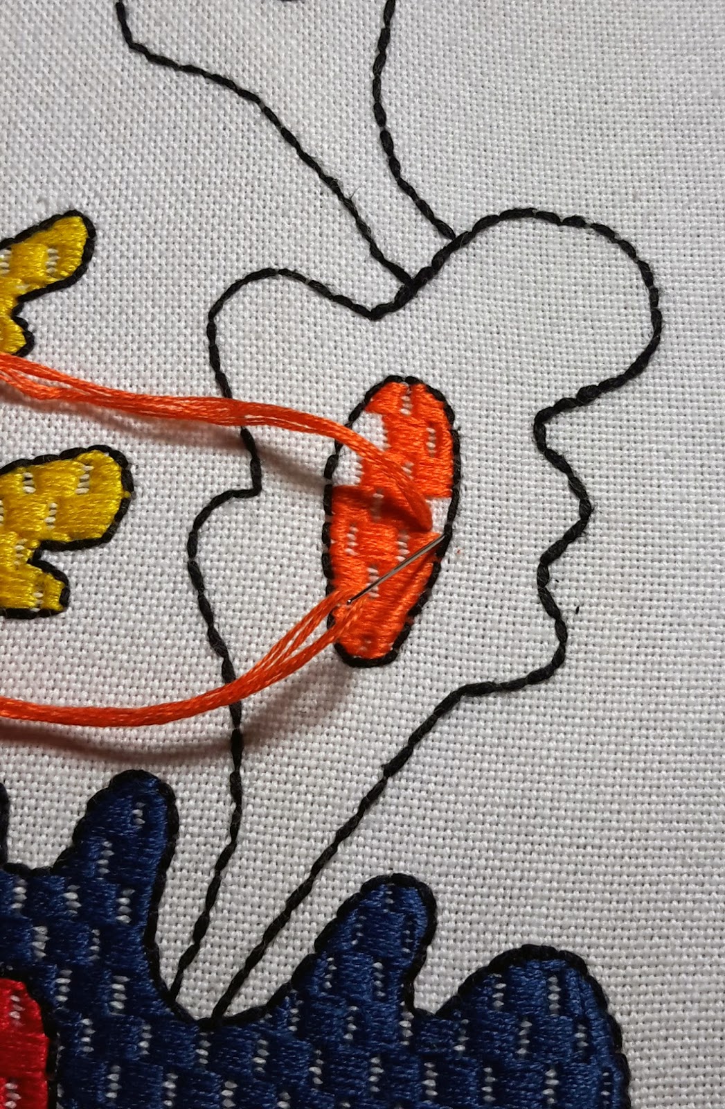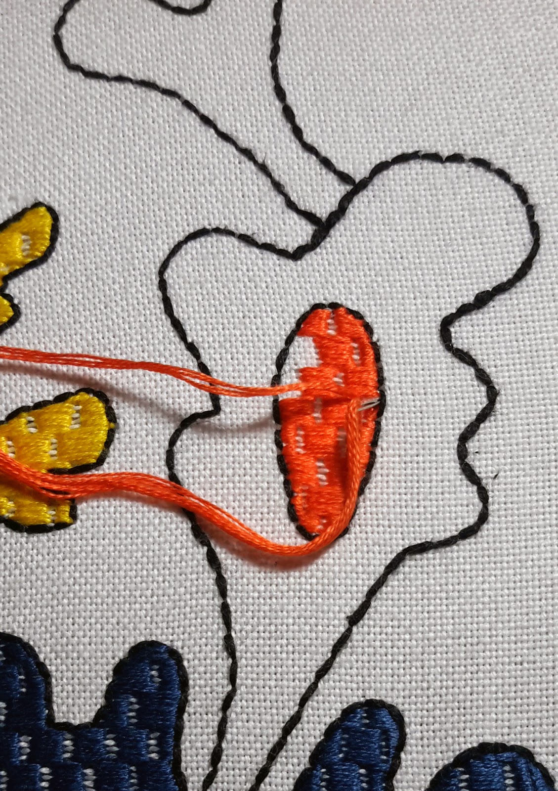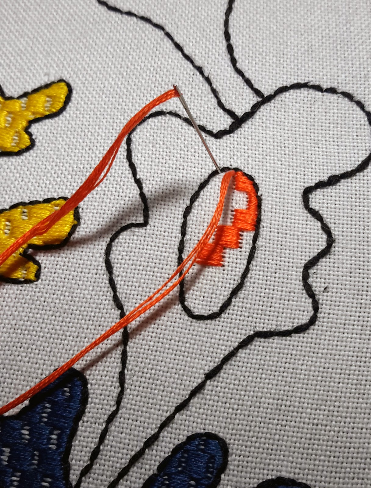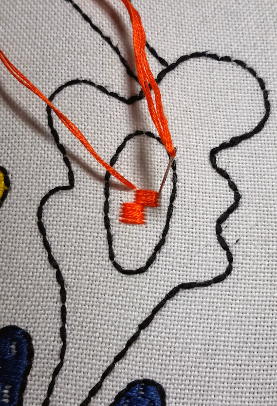 Теперь третий: мы видим,что третий кирпичик у нас возле контура,поэтому аккуратно его правую сторону заводим под черную нитку: