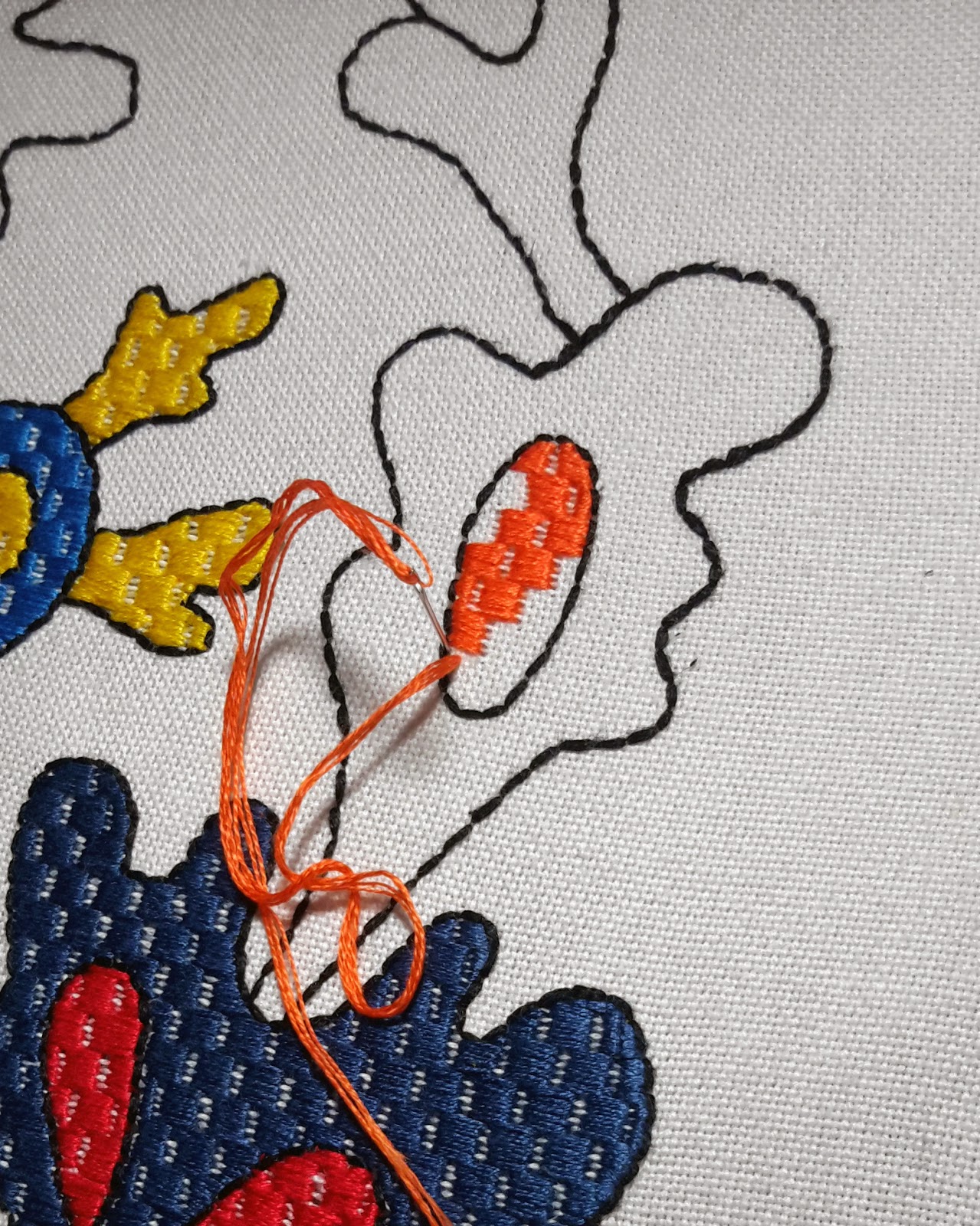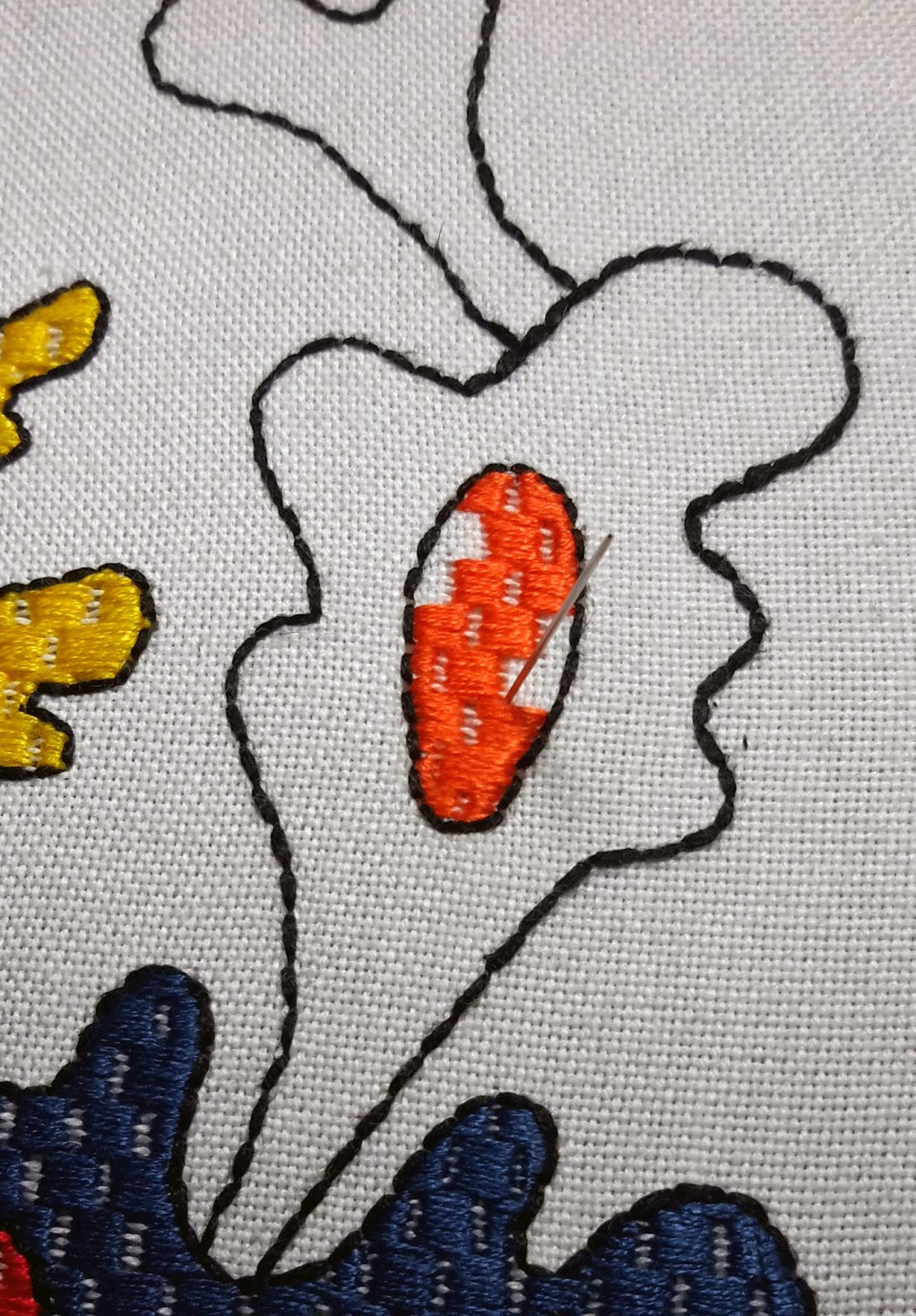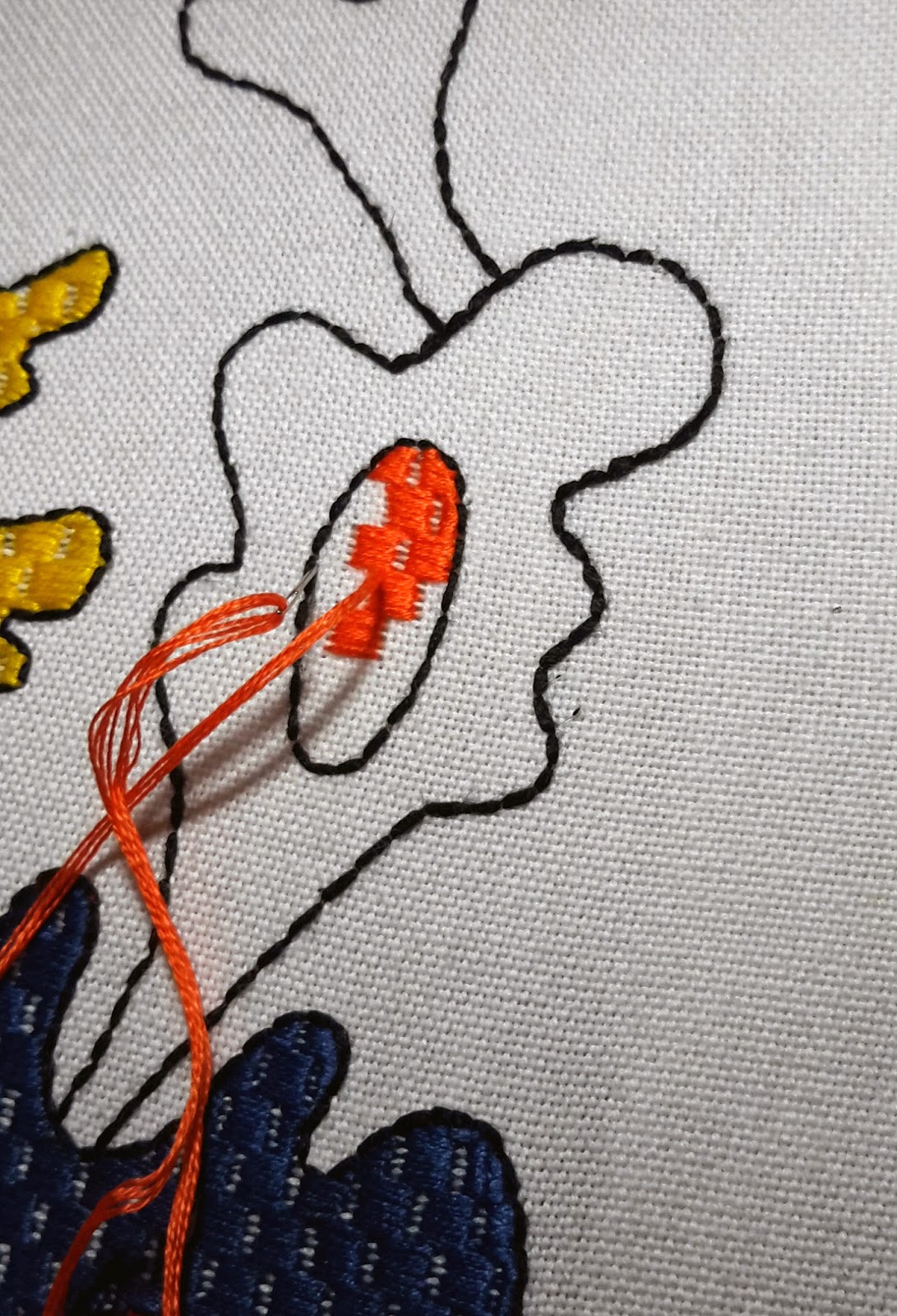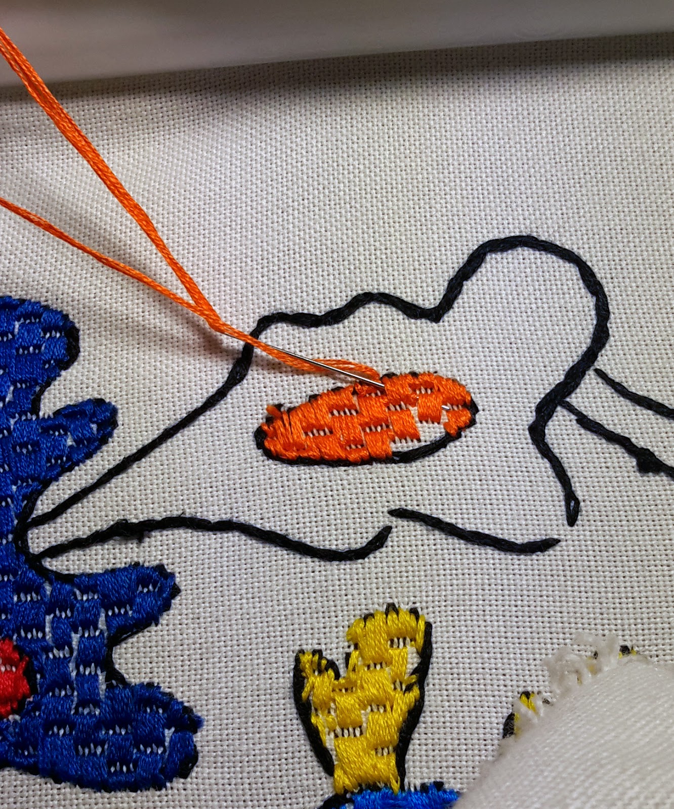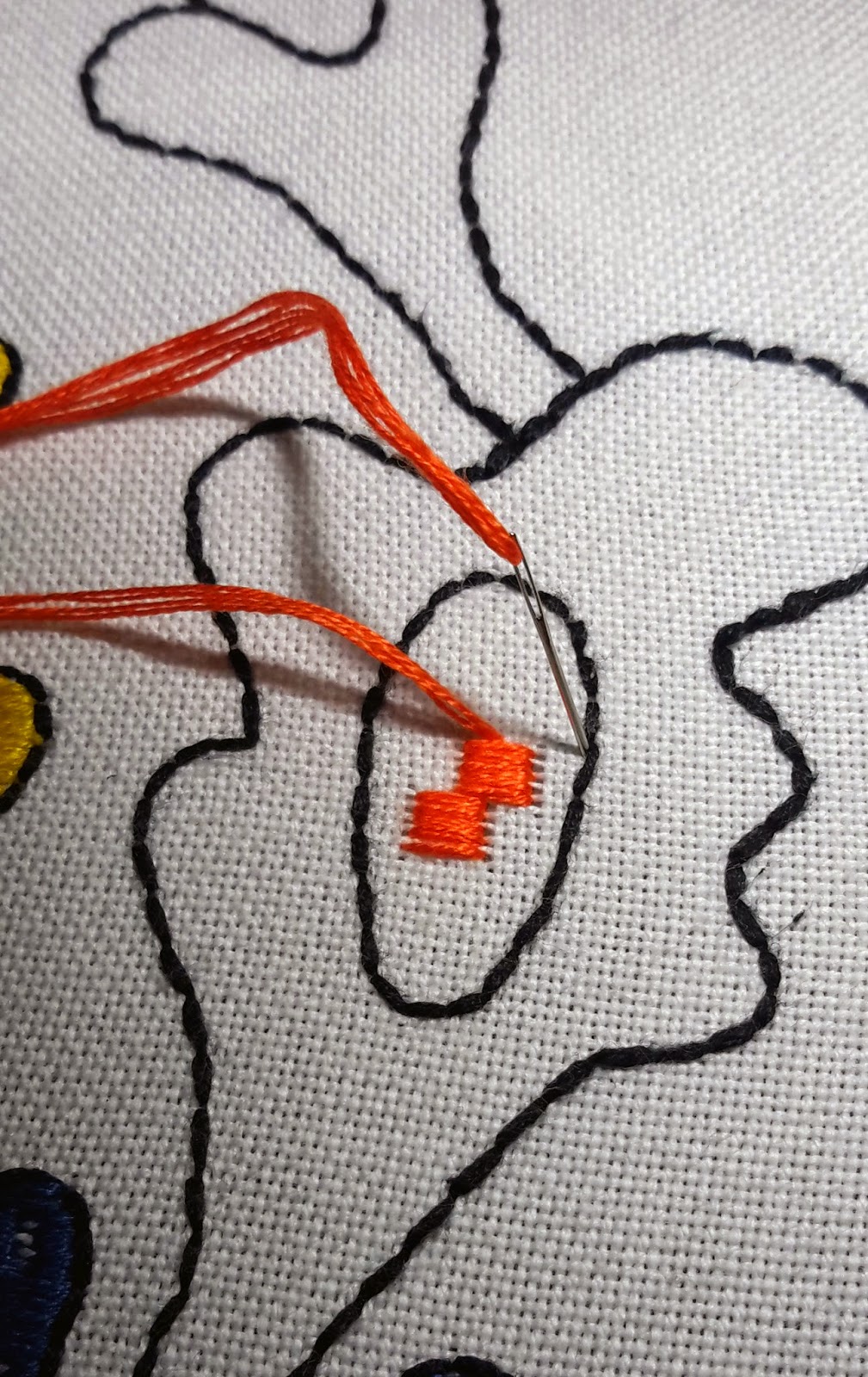 Теперь третий: мы видим,что третий кирпичик у нас возле контура,поэтому аккуратно его правую сторону заводим под черную нитку: