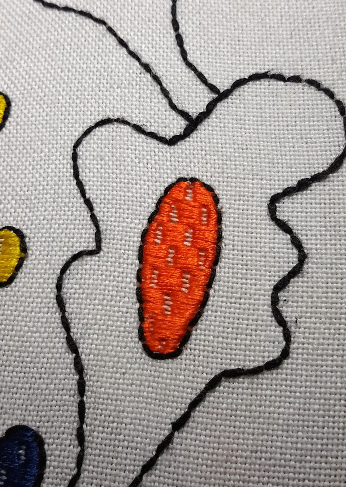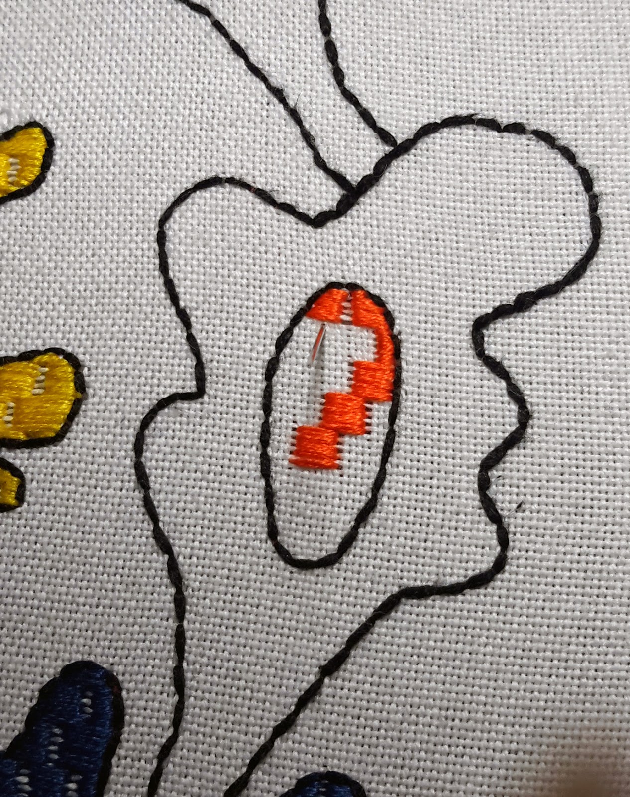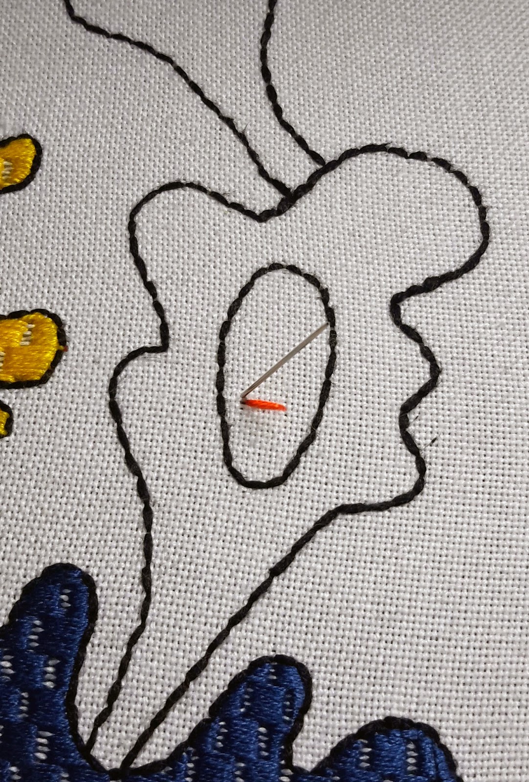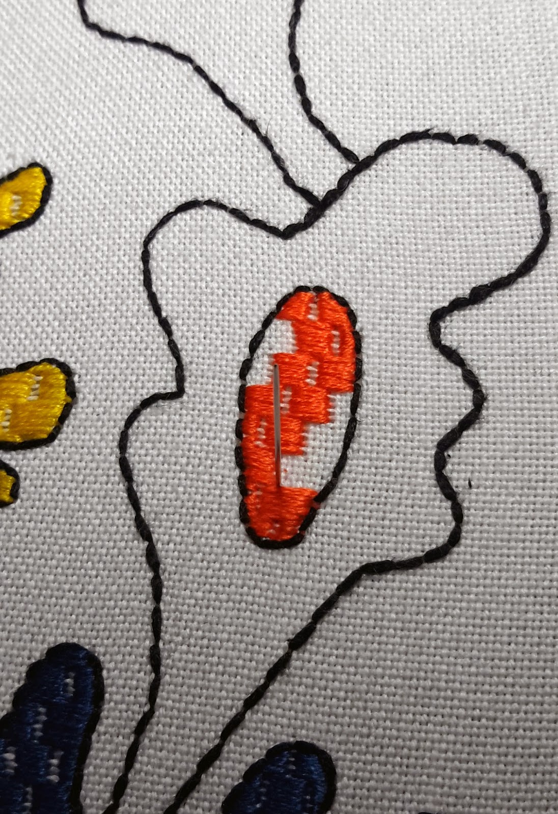 Теперь третий: мы видим,что третий кирпичик у нас возле контура,поэтому аккуратно его правую сторону заводим под черную нитку: