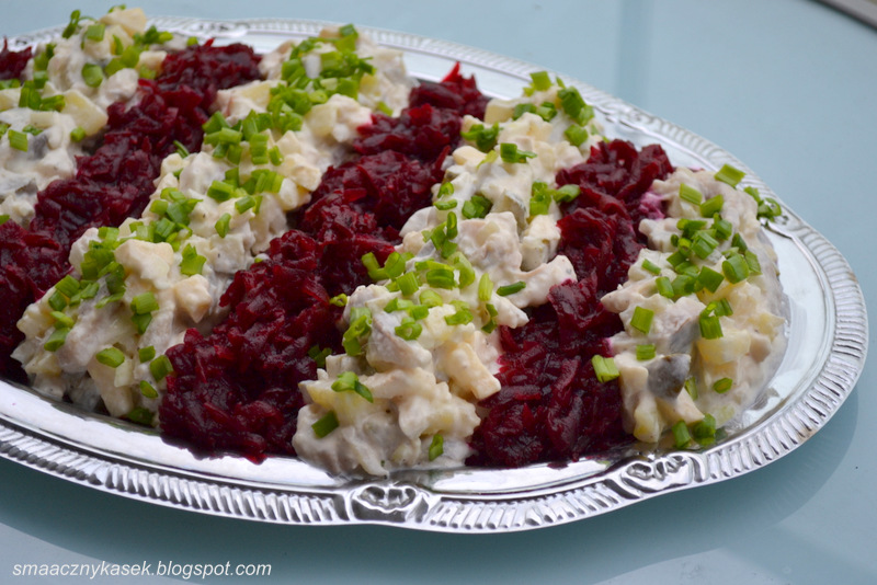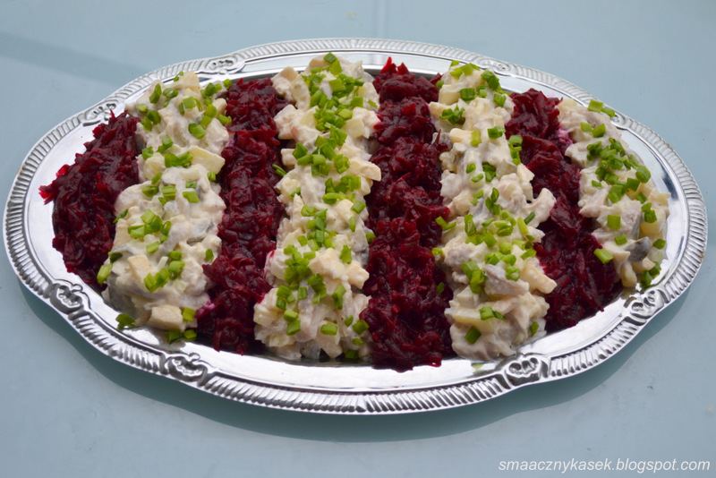 Na płaskim półmisku rozłożyć obok siebie, buraczki i sałatkę śledziową.