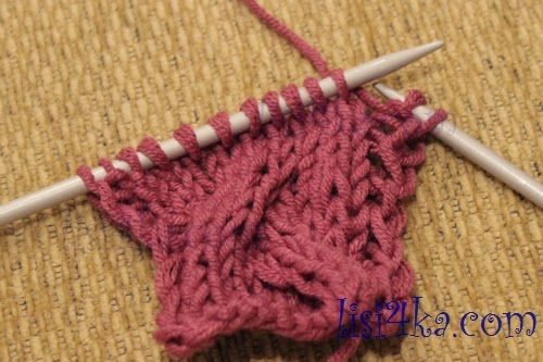 Провязываем три следующие петли (второе переплетение косы). На рабочей спицы получается: кромочная, изнаночная, Три непровязанных лицевых петли, и три провязанных петли.