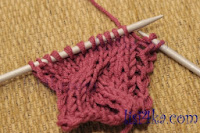 В начале все петли находятся на вспомогательной спице. Данный узор состоит из кромочной петли, изнаночной петли. и косы на девяти петлях с двумя перекрещениями по три петли в каждом.