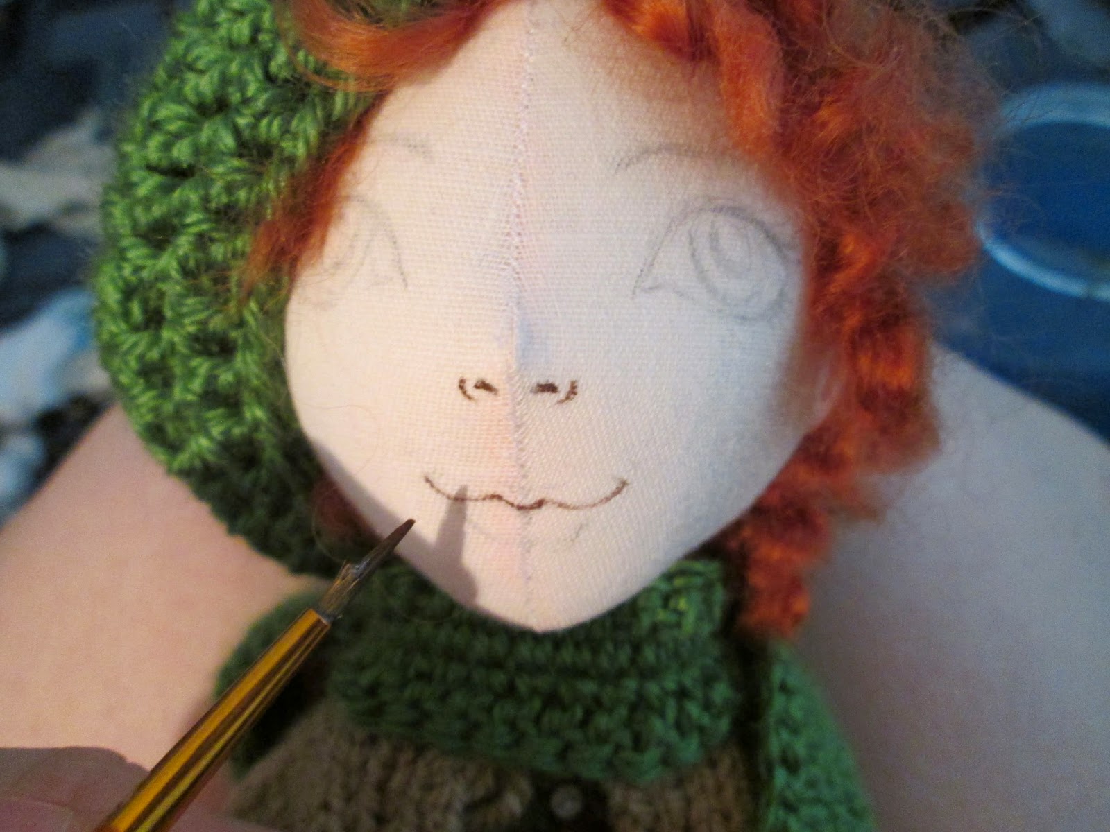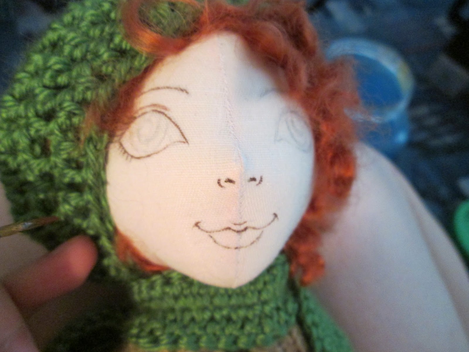 Теперь непосредственно личико.Я рисую его от руки простым средне-мягким карандашом,очень остро заточенным,чтобы линии были тонкими(ластик кстати их убирает,а ткань натянута очень плотно,так что это способствует)