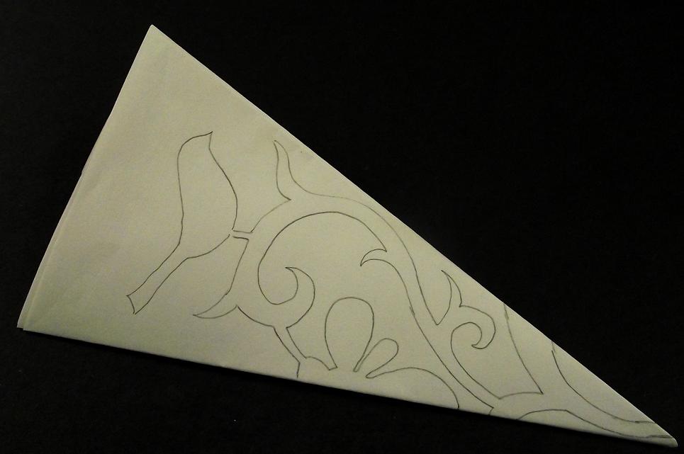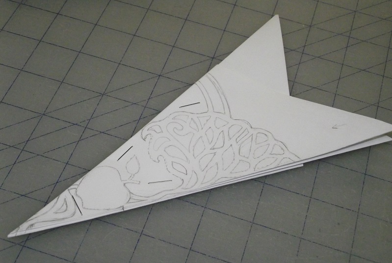 I begin with a piece of paper that measures 12" x 12" which is then folded......there are several sites that show how to create paper snowflakes, you can see the folding steps
