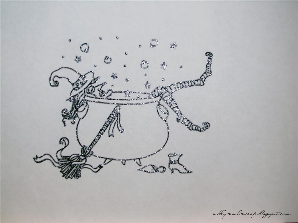 Итак, сначала распечатываю нужную мне картинку - хелоуинская пьяная ведьмочка. На фото мой набор гелевых ручек - купила в обычном канцелярском и прозрачная пудра Fine detail от Ranger (она мелкая и как раз ложиться пудрой, а не комочками и не сильно растекается при обработке феном).