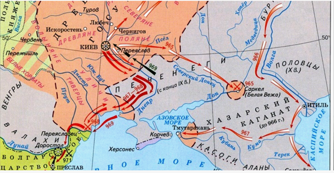 Значительная часть прежде хазарских земель тогда стала частью русского Тмутараканского княжества, что держало Причерноморье и Дон с Саркелом, ставшим Белой Вежей (Башней).