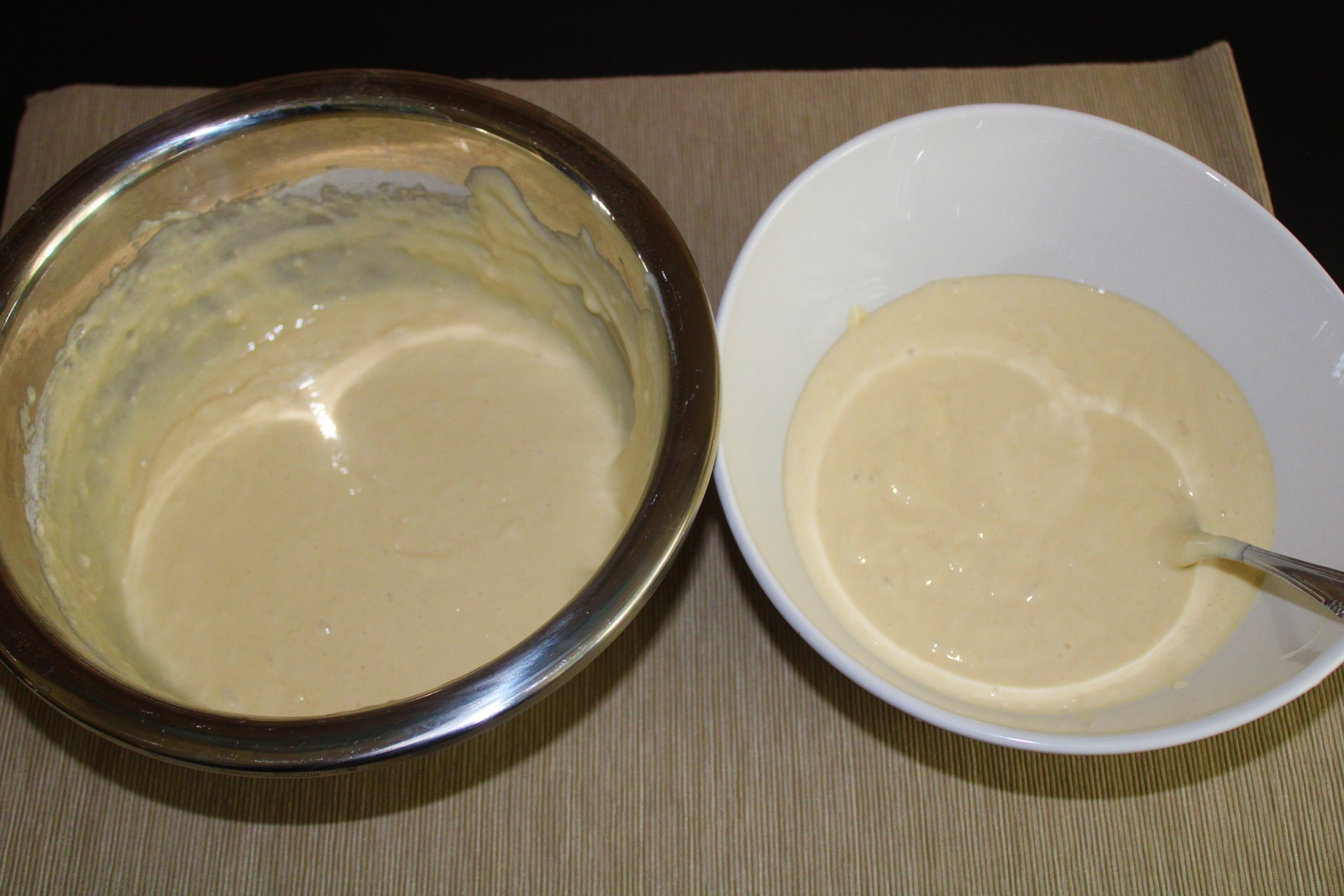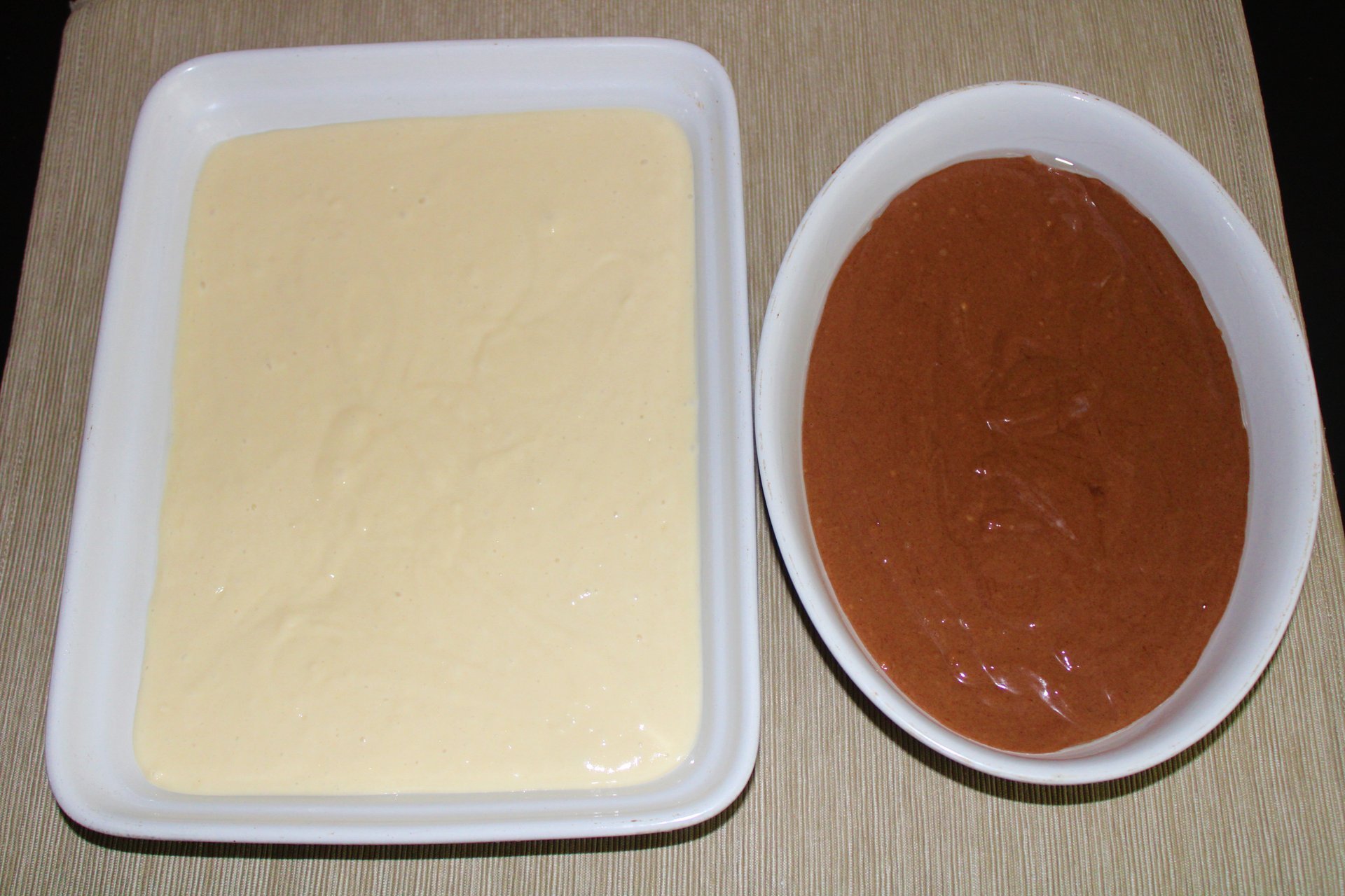 После интенсивного перемешивания ингредиентов тесто делим на две части и в одну добавляем 3 ст. л. какао.