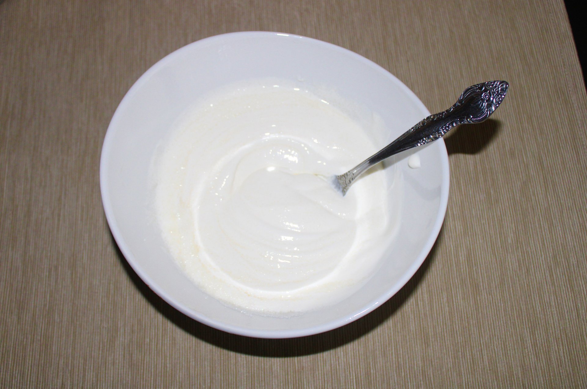 Пока коржи остывают, приступаем к приготовлению сметанного крема. 500 граммов сметаны, смешиваем со 100 граммами сахарного песка. Взбивать не надо.