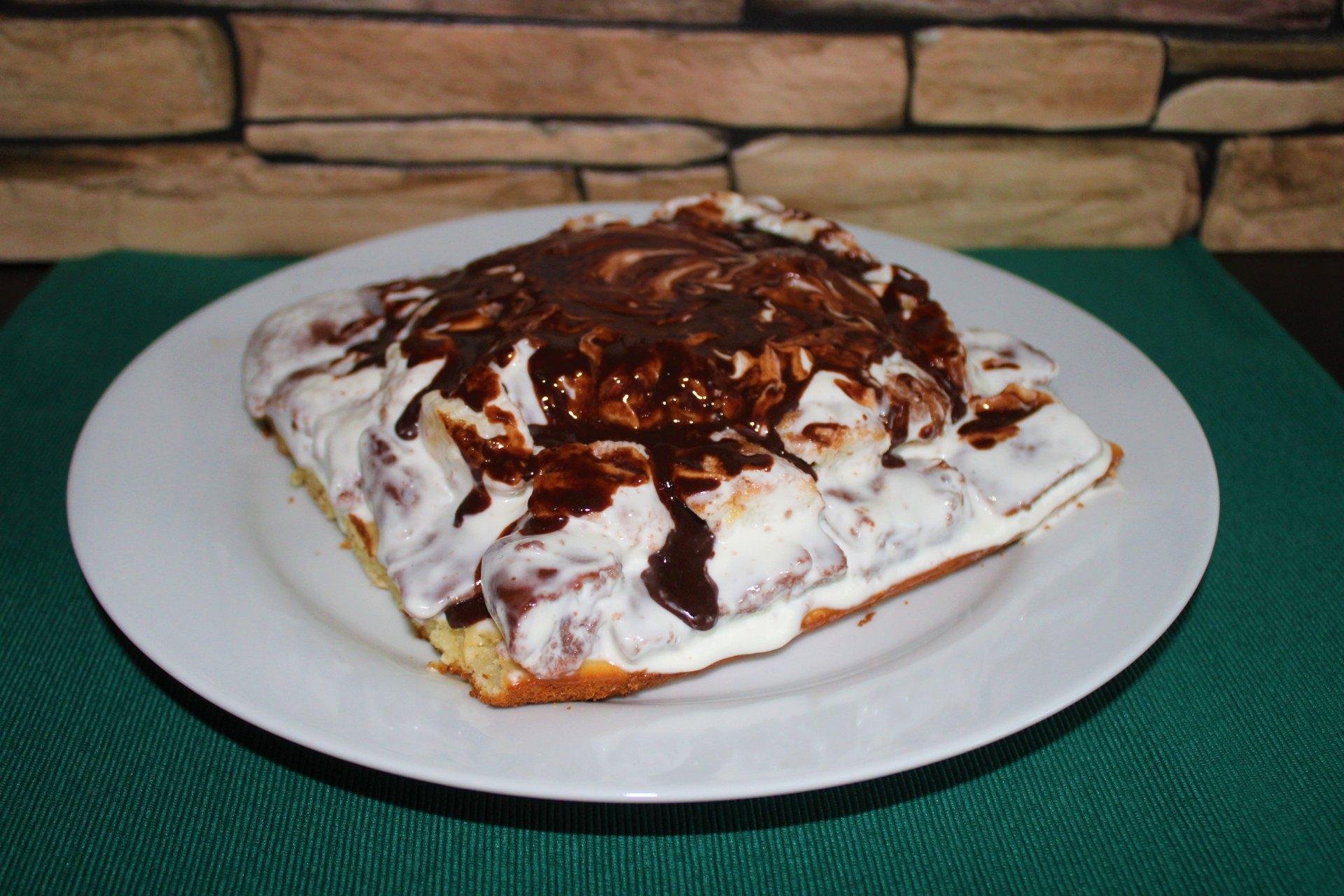 Осталось полить торт шоколадной глазурью. Для приготовления глазури смешиваем молоко и сахарный песок (5 ст. л + 5 ст. л.), дадим полученной смеси закипеть и аккуратно всыпаем 5 ст. л. какао, все перемешиваем и варим 5 минут.