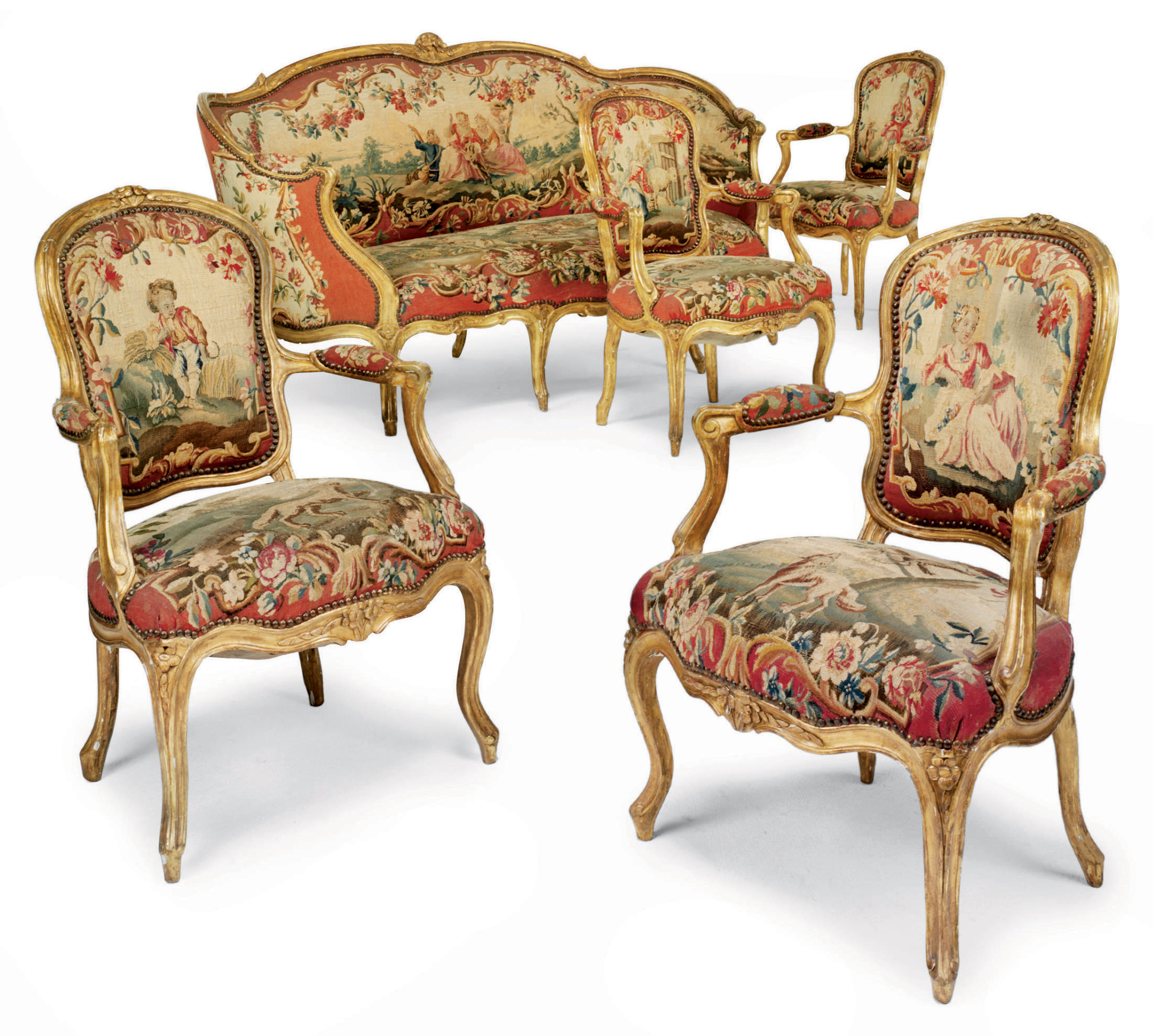 A SUITE OF LOUIS XV GILTWOOD AND AUBUSSON TAPESTRY SEAT FURNITURE