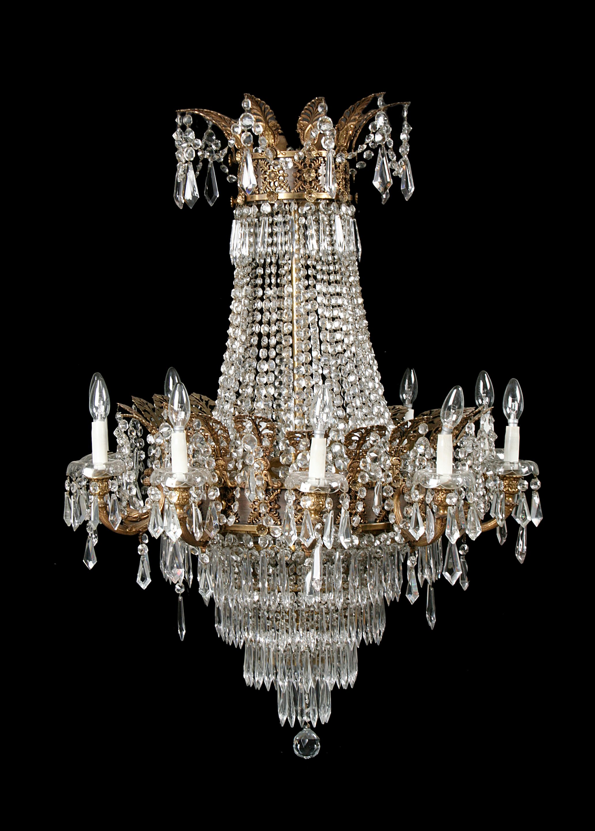 An Empire style gilt metal and cut glass twenty light tent and waterfall chandelier