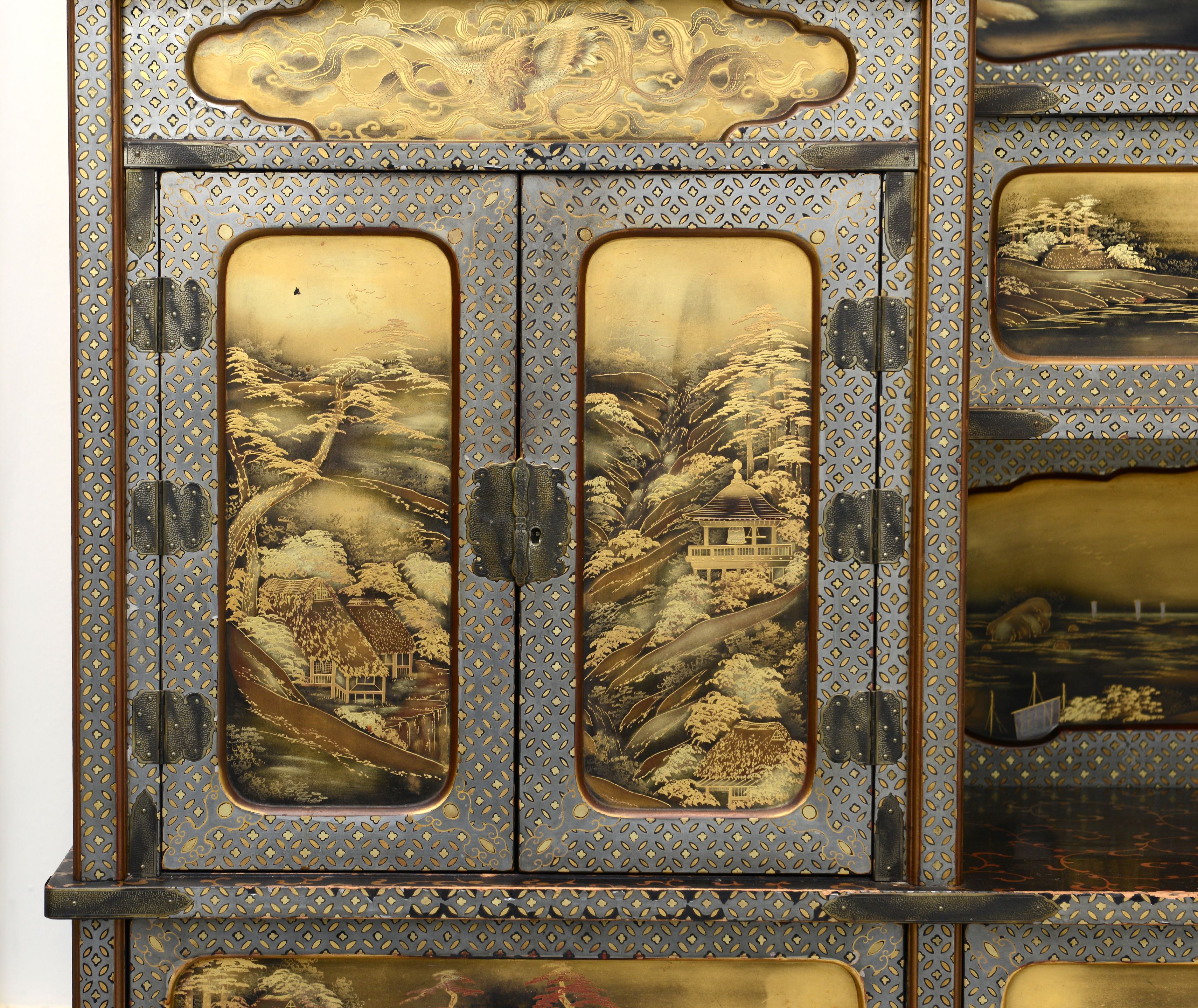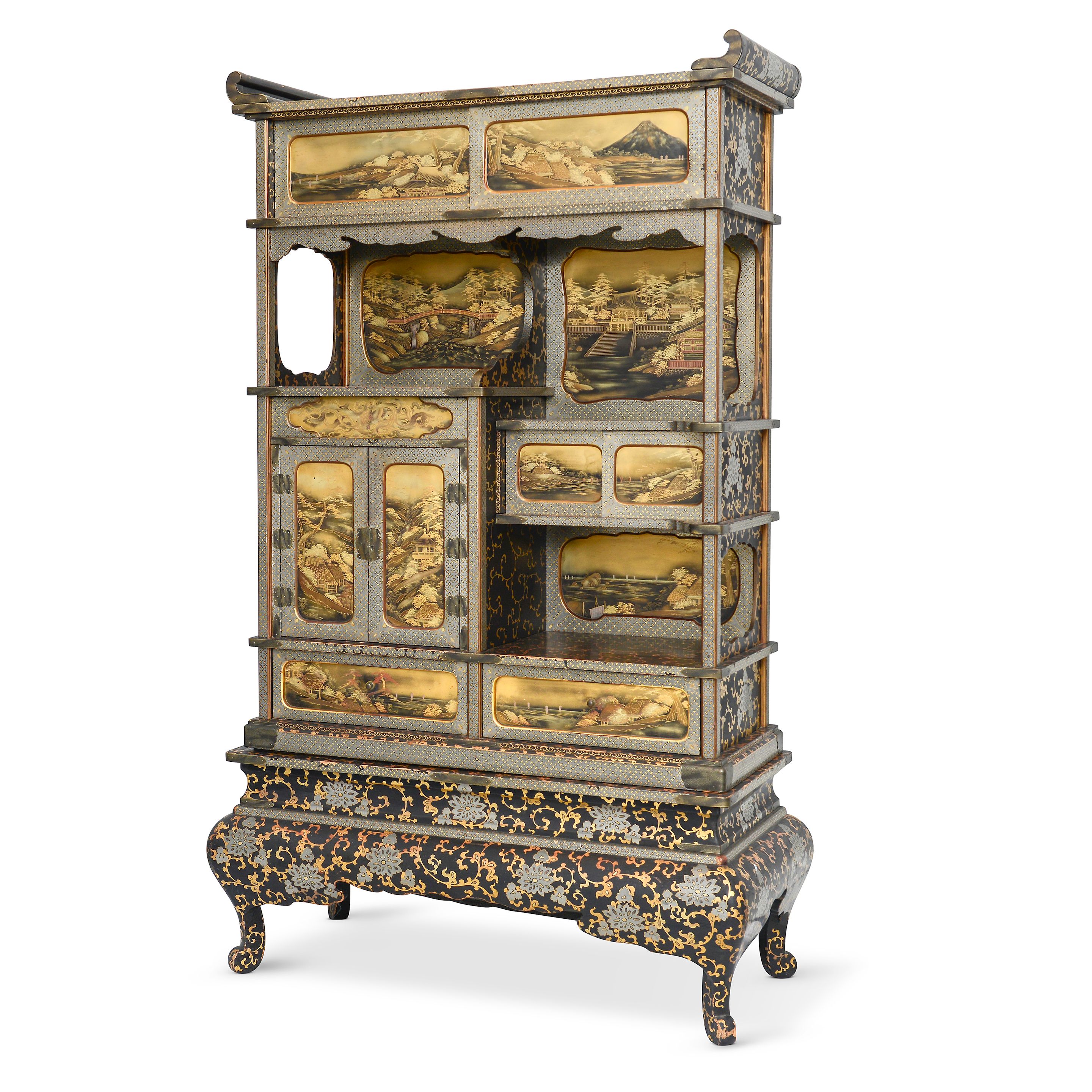 A Japanese two-part silver gilt lacquer Shodana (display cabinet)