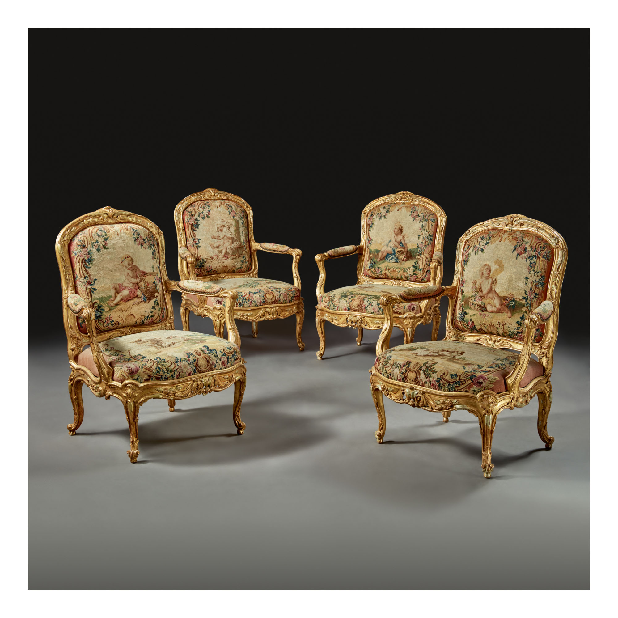 A SUITE OF LOUIS XV GILTWOOD AND AUBUSSON TAPESTRY SEAT FURNITURE CIRCA 1760
