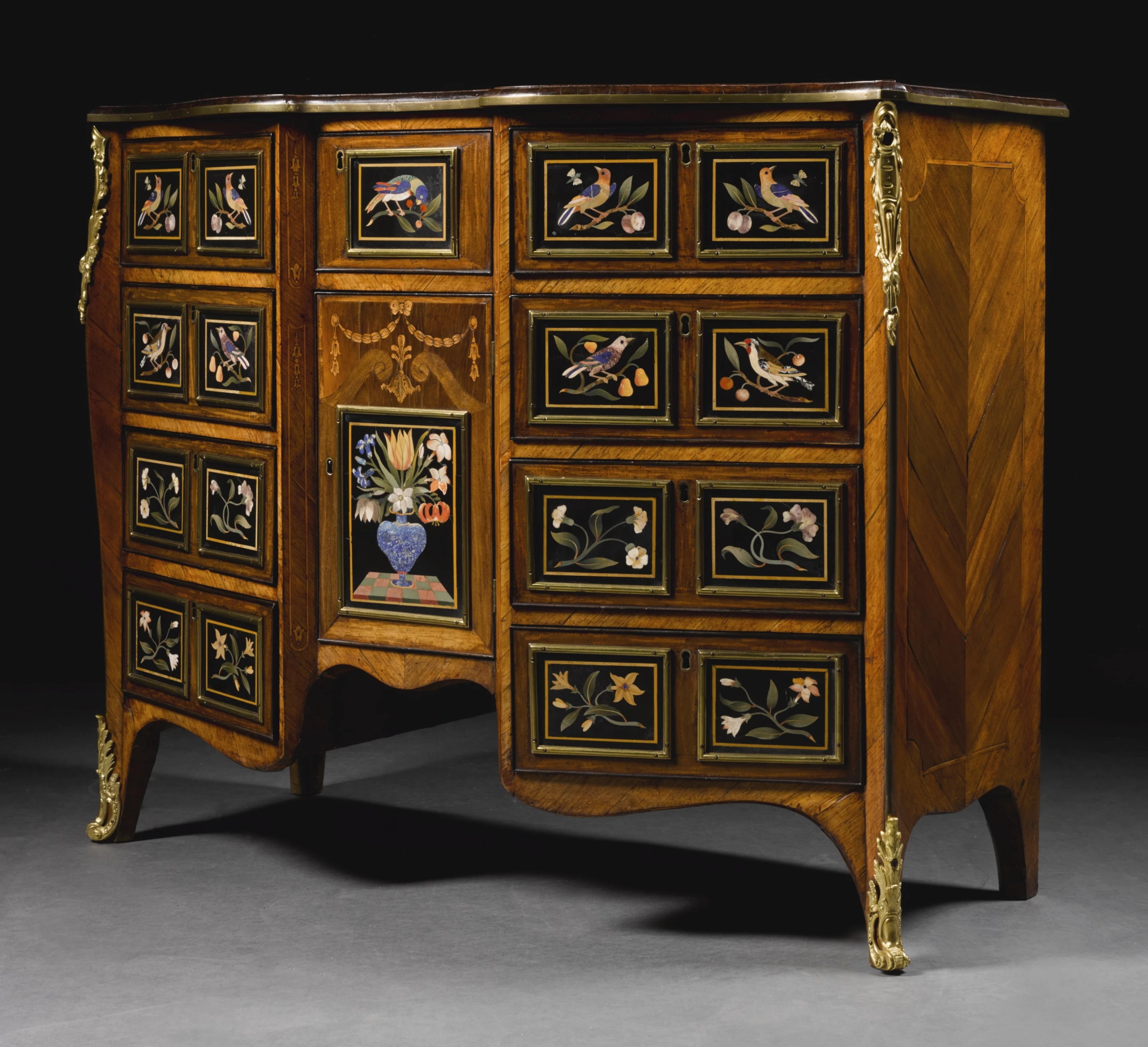 A George III gilt-bronze and pietre dure mounted rosewood and marquetry commode attributed to Pierre Langlois, circa 1770